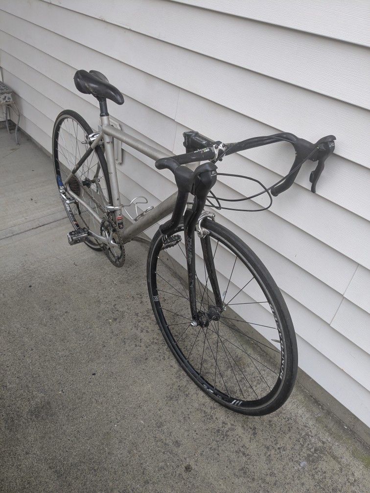 Specialized S‑Works E5 (54cm) built with Columbus Squadra Corse alloy tubing and carbon fork. This is one of Specialized’s iconic early‑2000s race frames — light, stiff, and still highly respected for its ride quality. The bike is equipped with Campagnolo Chorus crankset (175mm), Campagnolo Chorus 10‑speed rear derailleur, and Campagnolo Daytona brakes. Currently running Micronew 2×7 shifters for basic functionality, but the original Campagnolo shifters are included (one may need a rebuild, which is common and fully serviceable). Bike shifts, brakes, and rides, but would benefit from a tune‑up and a rear wheel truing. Bars are intentionally left unwrapped so the next owner can choose whether to reinstall the original Campagnolo shifters. --- Condition Notes - Two cosmetic dents on the top tube. Rounded, no cracks or creases. - Scratches and faded decals consistent with age. - Rear wheel needs truing (moves side‑to‑side). - Needs bar tape. - One original Campagnolo shifter may need a rebuild. - Mismatched wheels (Bontrager front, Nishiki rear). --- Why This Bike Is Still Special - True S‑Works E5 alloy frame — cult classic among riders - Columbus Squadra Corse tubing - 54cm size fits a wide range of riders - Campagnolo Chorus crank + derailleur - Daytona brakes - Lightweight, fast, and responsive - Great platform for a Campagnolo restoration or retro‑modern build - Original Campy shifters included Price reflects condition and included Campagnolo components.