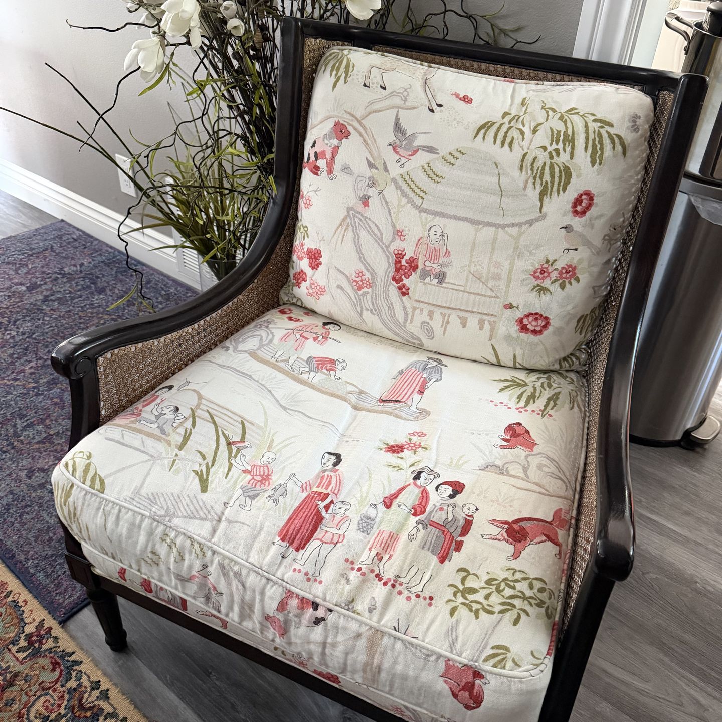 Matching Couch & 2 chairs Solid Wood Frame – Beautiful Statement Piece Absolutely stunning vintage accent chair with a solid dark wood frame and woven cane back. The cushions feature a gorgeous toile-style fabric with red and green detailing that adds so much character and charm. This chair is sturdy, comfortable, and makes the perfect statement piece for a living room, bedroom, office, or reading nook. The cane backing is in great condition and the frame is solid. ✨ Details: • Solid wood frame (dark finish) • Woven cane back • Removable seat & back cushions • Unique toile fabric upholstery • Very sturdy & well made Great vintage condition with normal light wear consistent with age. Perfect for traditional, eclectic, cottage, or collected home styles. $80 for 2 chairs $100Couch OBO