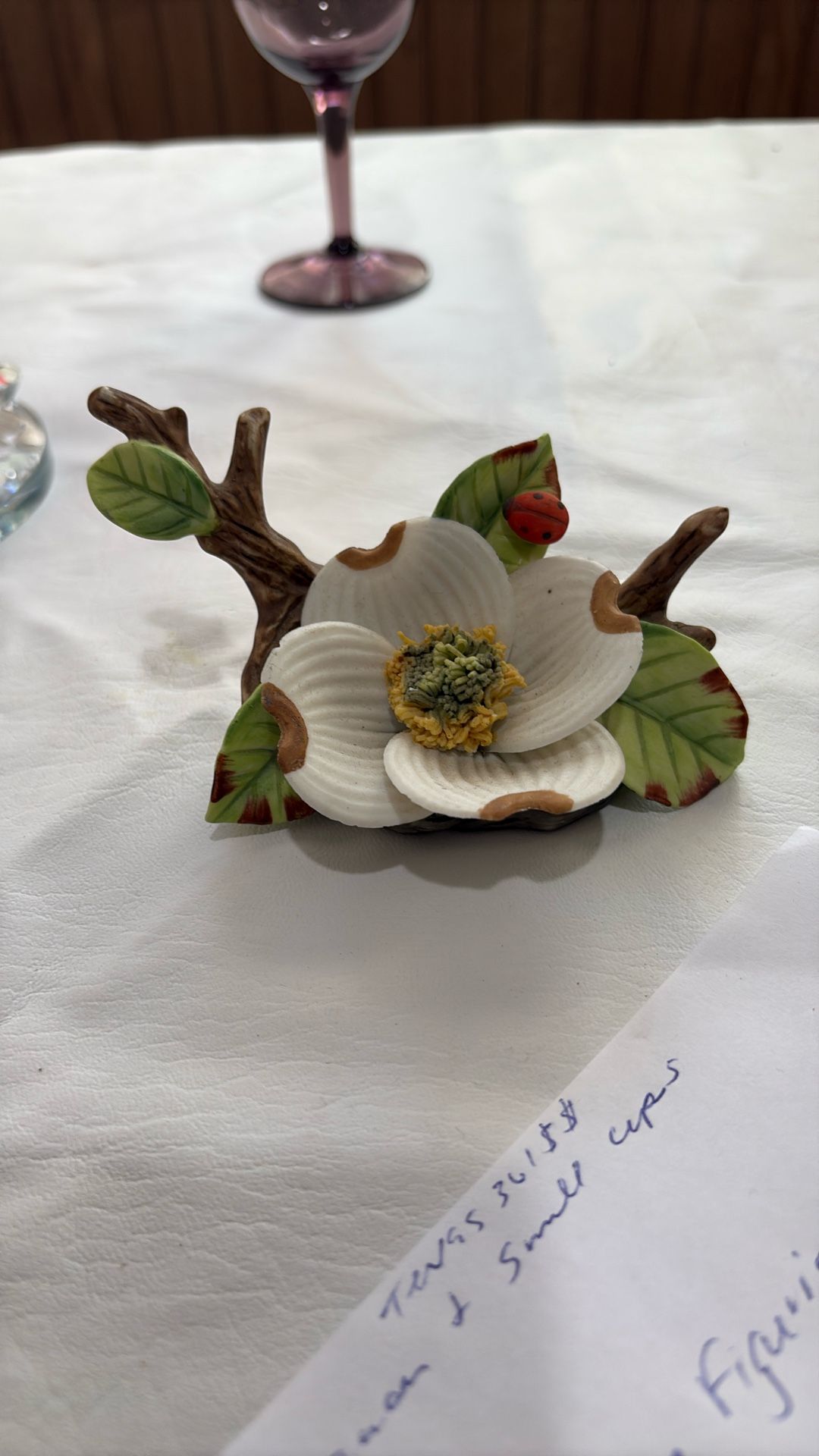 Vintage White Dogwood Sculpture Figurine With Lady Bug 1985 Porcelien