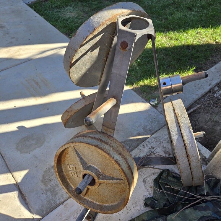 Two 45lb plates, two 35lb plates, an Olympic bar, and a weight rack. All of it's been outside for years so it's got some rust and wear, but everything is solid and works great for lifting. Perfect for starting a home gym. First come, first serve, pickup only.