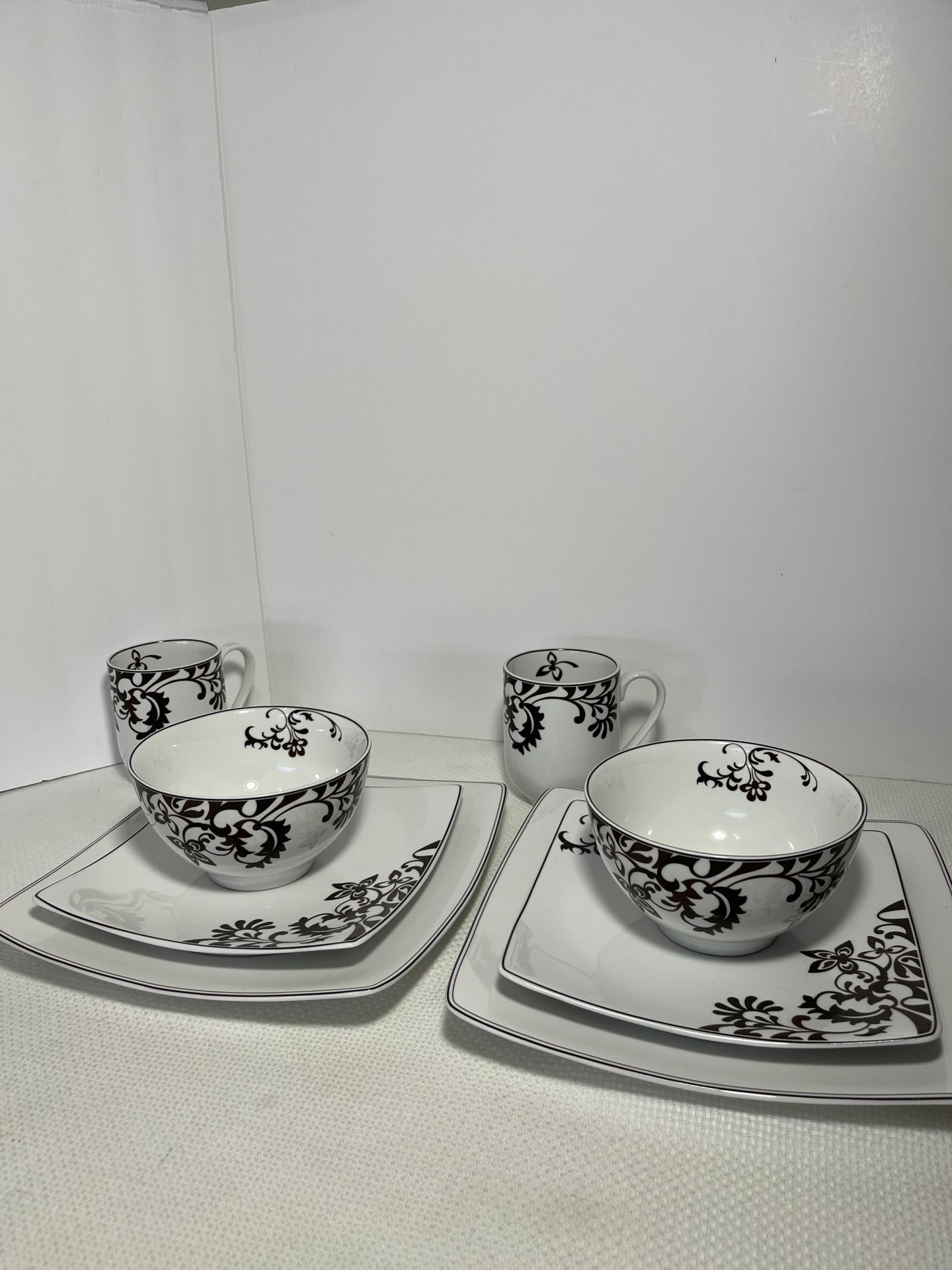Mikasa chocolate swirl Gourmet Basics. Pattern IND04 Porcelain- dishwasher and microwave safe 2 - 10” dinner plates 2 - 7.5” lunch plates 2 - bowls 2 - mugs 8 pieces total. No chips or cracks For pickup the major cross streets are 75ave bell rd