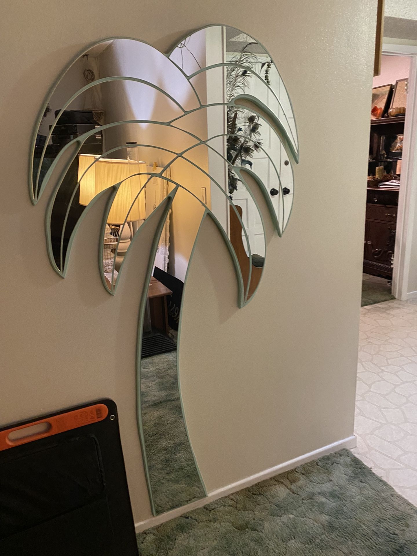 Vintage Aqua Green Palm Tree mirror Possibly 1980’s aqua green palm tree mirror wall decor visible crack/break show I’m pictures