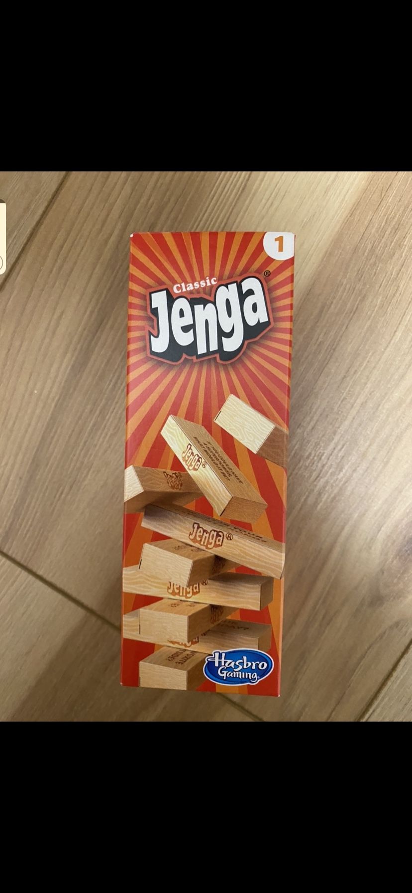 Small portable Jenga Hasbro game, miniature and made out of strong paper. Fun interactive family game and good for travel.