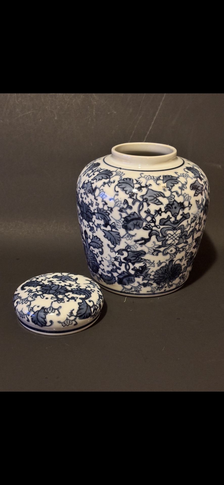 Adorable Blue and white decorative Ginger Jar with Lid, in good condition no ships no cracks measurements are in the pictures.