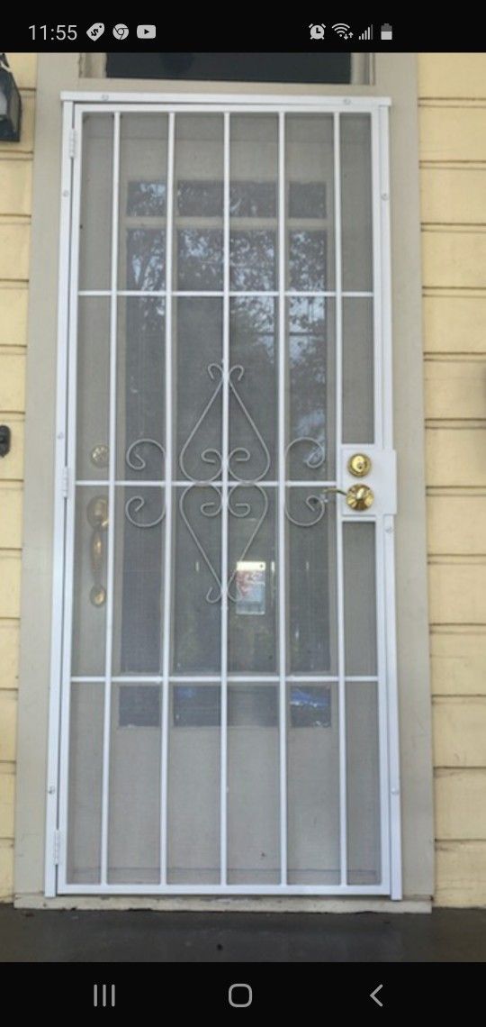 3 Piece steel storm door with door handel and debolt. Powder coat white finish. Need new mounting hardware Can offer install of door and new deadbolt and door cost for $425. Dimensions are 82" height x 34 1/2" width