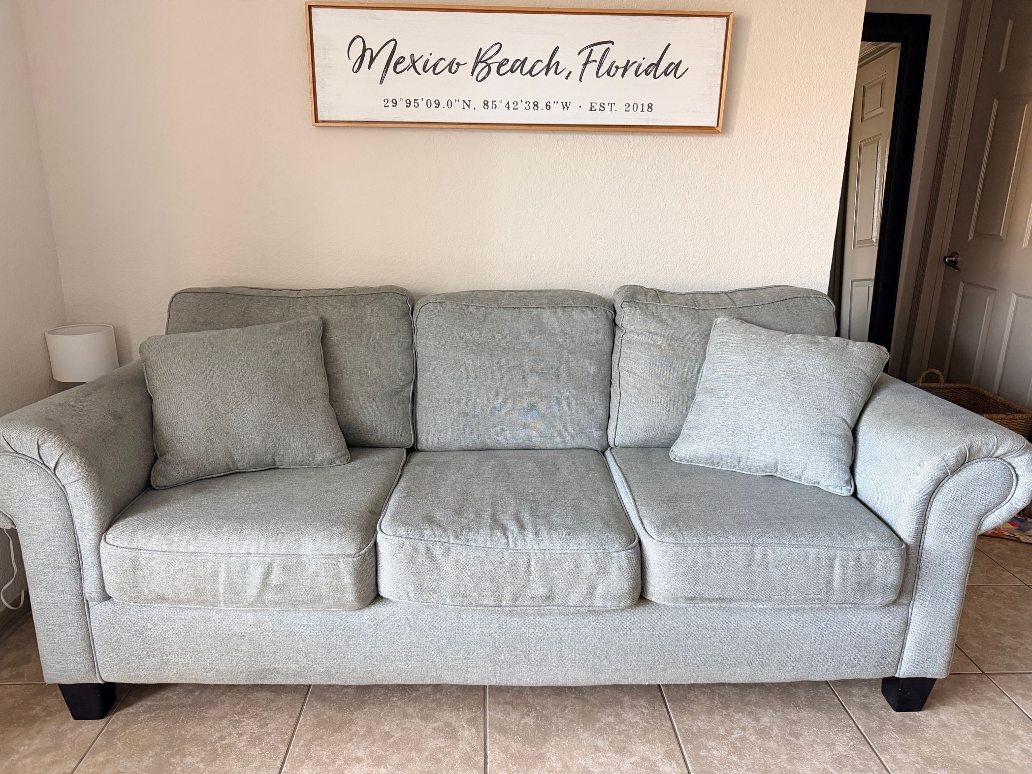 Comfortable, well-kept sofa originally purchased from Rooms To Go. Measures 90 inches long and 42 inches wide, so it comfortably seats three adults without feeling cramped. Upholstered in a soft light blue/gray fabric that works well with neutral or coastal-style spaces. Cushions are supportive and plush, with removable accent pillows included. No rips, tears, or structural issues—this couch has plenty of life left and has been in a smoke-free home. Normal, minimal wear consistent with a few years of use. Great option for a living room, apartment, guest space, or office lounge. Pickup only. Priced to move.