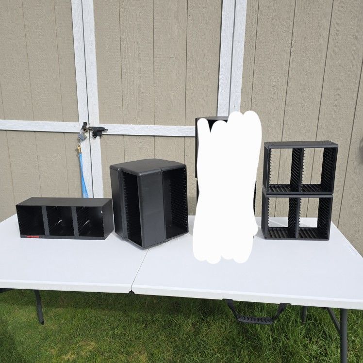 4 misc CD storage racks. Selling for $20 each, discounts for buying multiples. $60 for all. OBO 2x OpenStock stackable rectangular racks. Each holds 30 CDs. 11.25" X 8.5" X5x Laser Line spinning square rack. Holds 100 CDs (?). 14" x 11" x 11" Laser line rectangular rack. Holds 36 CDs. 16.75" x 6.5" x5"