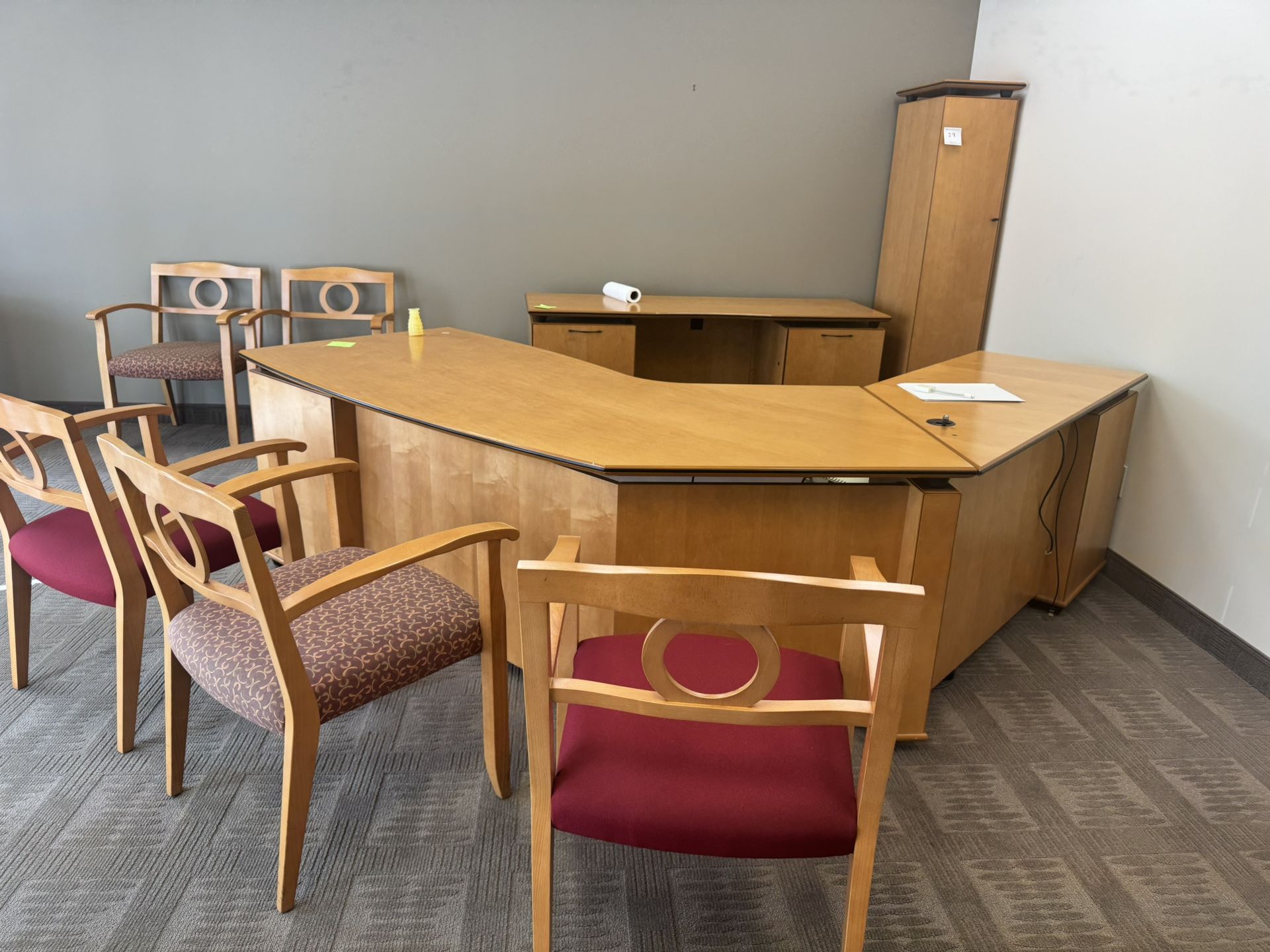 This set includes credenza, two desk, table and four chairs. Can be sold as a set or as individual items. Set price 150 Individual Credenza 40 Chairs 35 Desk 50 Small Desk 35 Table 25