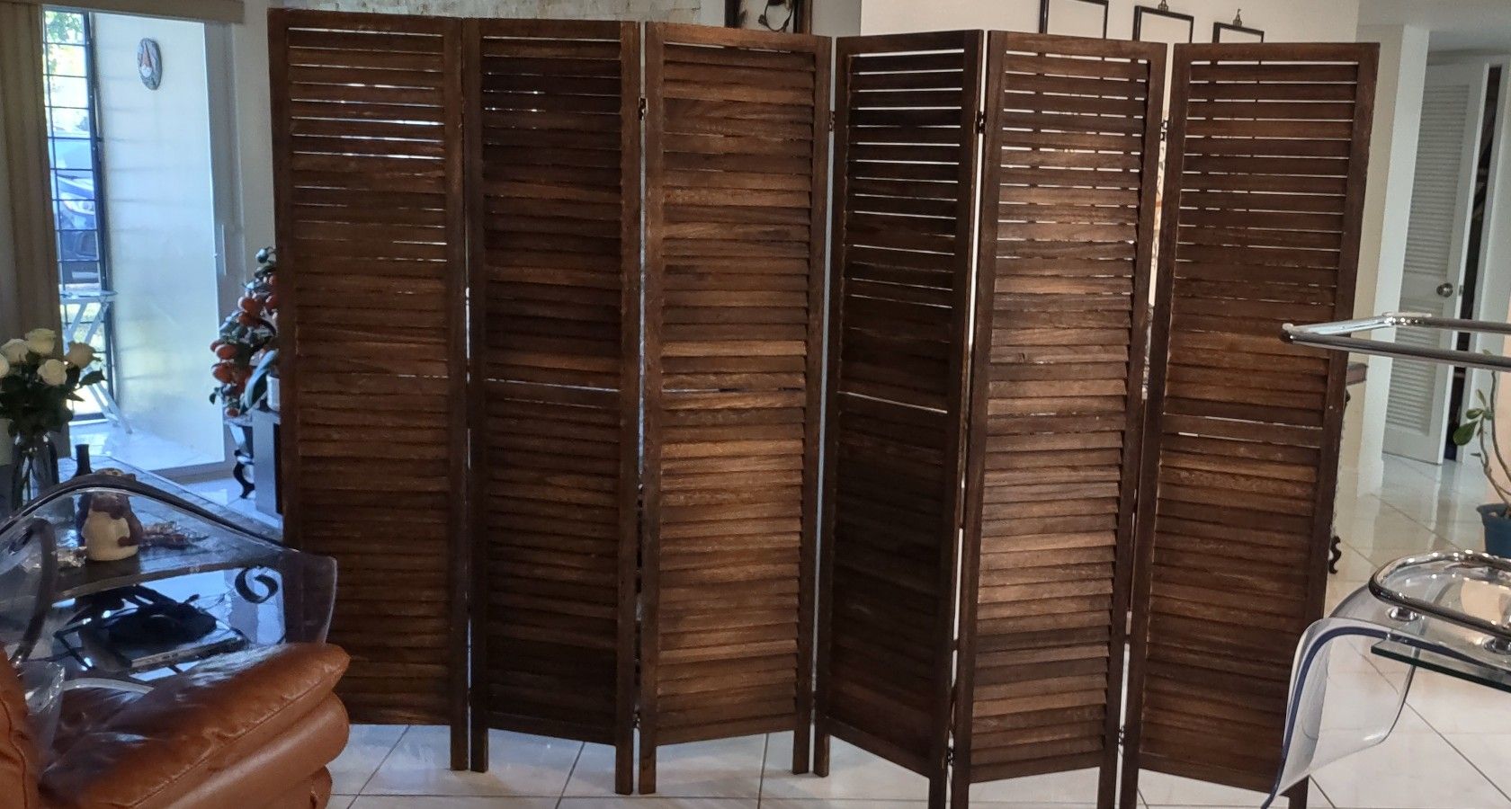 6- Multi-Panel Wooden Louvered Room Divider, similar in style to the Wayborn Venetian Screen or Rancho, measures 67 inches high x 16 inches wide per panel.