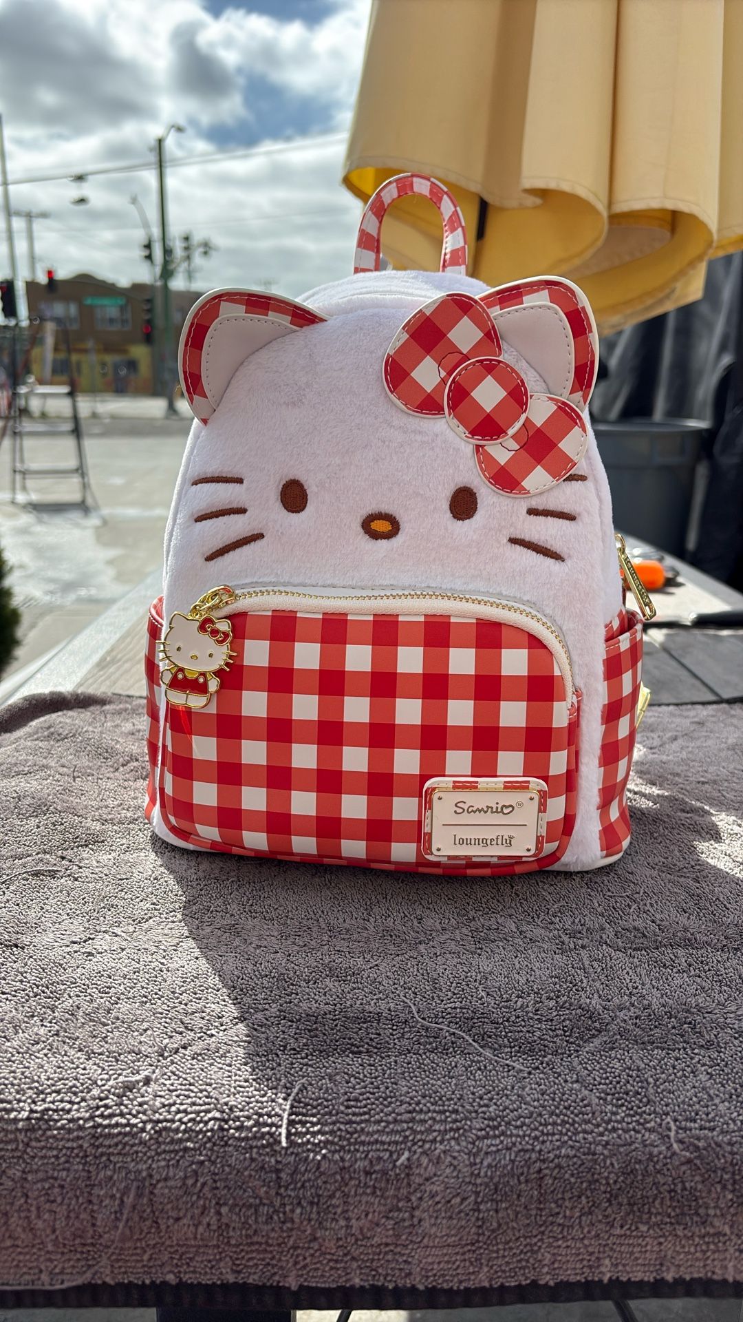 New With Tags Loungefly Sanrio Hello Kitty Gingham Cosplay Mini Backpack This red-and-white-checkered backpack features Hello Kitty’s adorable face in cuddly plush and embroidered detail. Her matching gingham bow finishes the look in supercute style. The front pocket adds a lovely touch, and the enamel zipper charm allows Hello Kitty to make an encore appearance. On the back, she has spread out a picnic blanket and is enjoying all kinds of treats. This backpack is an officially licensed Sanrio product.