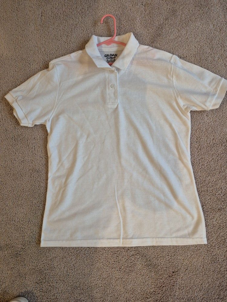 Women's new Polo Shirts. These are the perfect Cotton,3-Button, Short Sleeve, Collared Tops. They are Summer Cool and are the perfect Uniform Casual Shirts. Perfect for kids also to wear to school. Size M. Colors available: white, dark gray, light gray and pink. Each shirt is $3. Tags are still attached. New and never worn.
