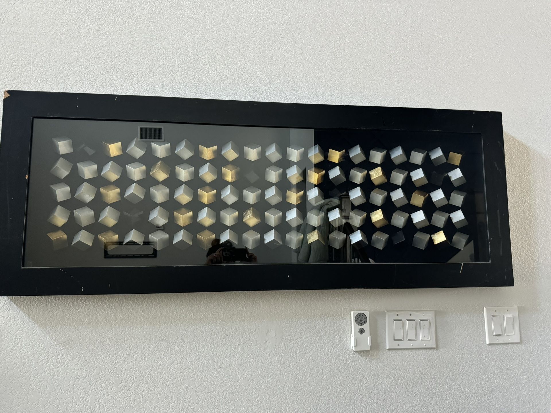 It's your one way ticket to midnight...call it heavy metal!" Set in a shadowbox frame, this work makes an immediate impact on the wall with its cubic, dimensional design and tri-tone metallic finish. Shadowbox. Set to hang vertically or horizontally. Will need to be refinished , has some damage pictured. Retails for $599