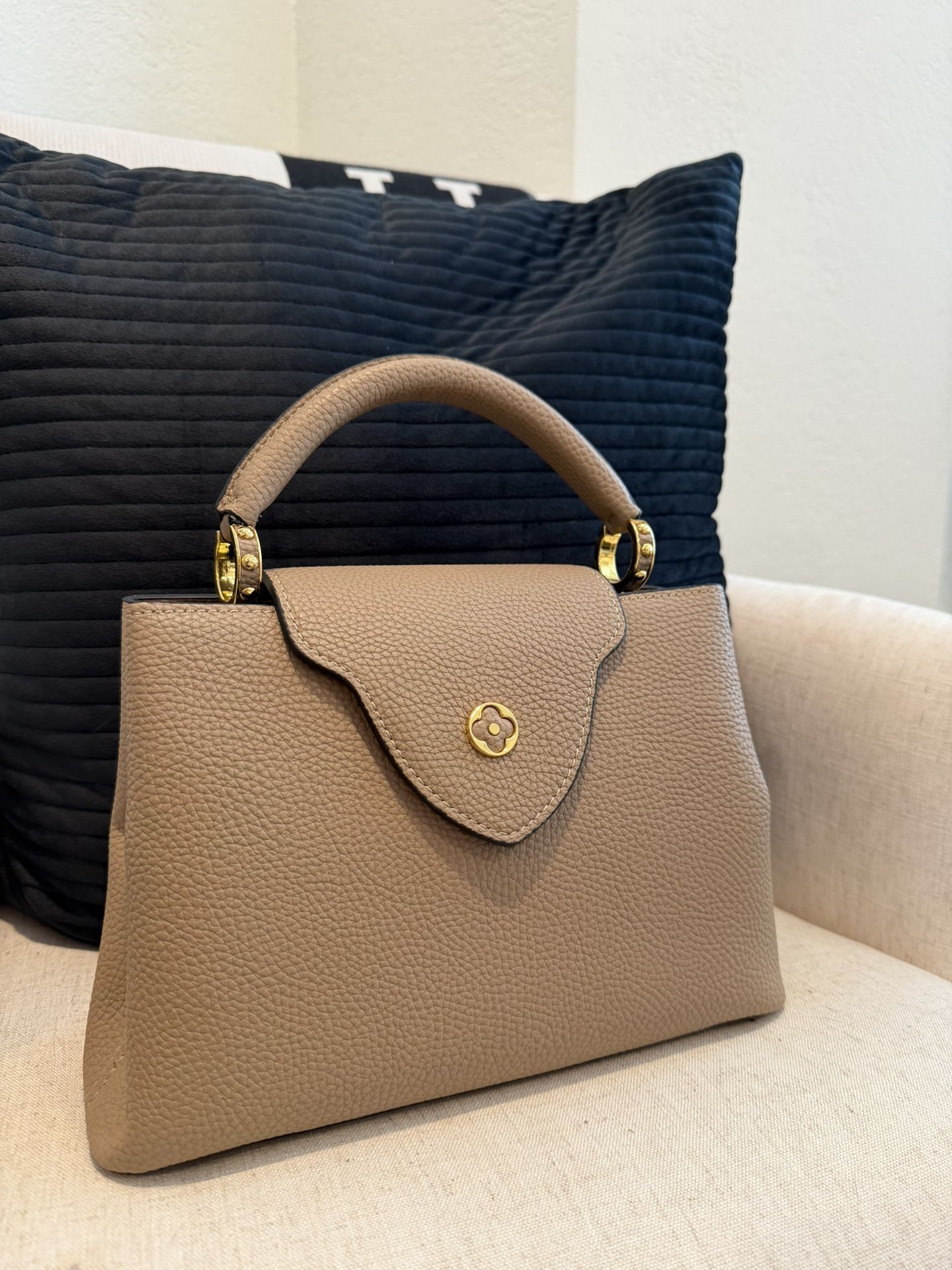 Brand new Taupe leather bag with cross body strap Genuine leather No rips, no stains no scuffs Top color with gold hardware If you have more questions, please DM me Local pick up only no shipping Local pick up in Victorville, Rialto, Colton or Fontana areas