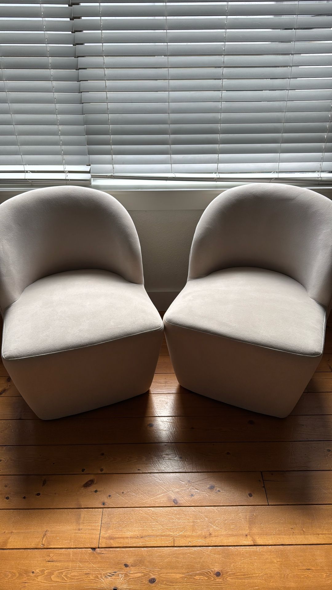 Set up two chairs a few years old, but barely ever sat in. In good condition with just a few scratches on one chair as noted in the pictures. $75 each or $125 for the set. Swivel functionality still works great!