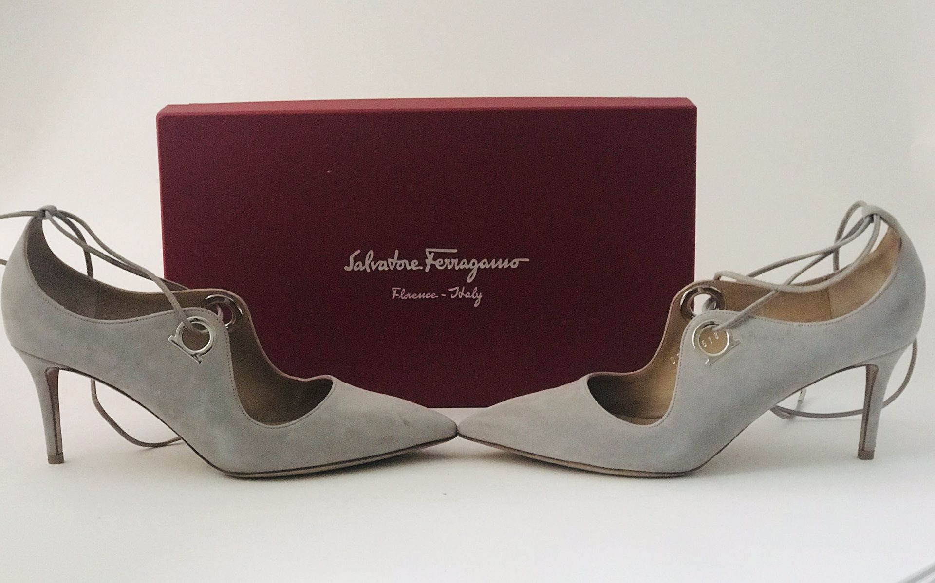 Only worn once! True to size Women’s size 7 Sold out everywhere super popular shoe model Beautiful Gancio hardware adds stunning signature style to a pointy-toe suede pump completed with a slim wraparound ankle strap. 3" heel (size 7). Wraparound ankle strap. Leather upper, lining and sole. By Salvatore Ferragamo; made in Italy. Salon Shoes.