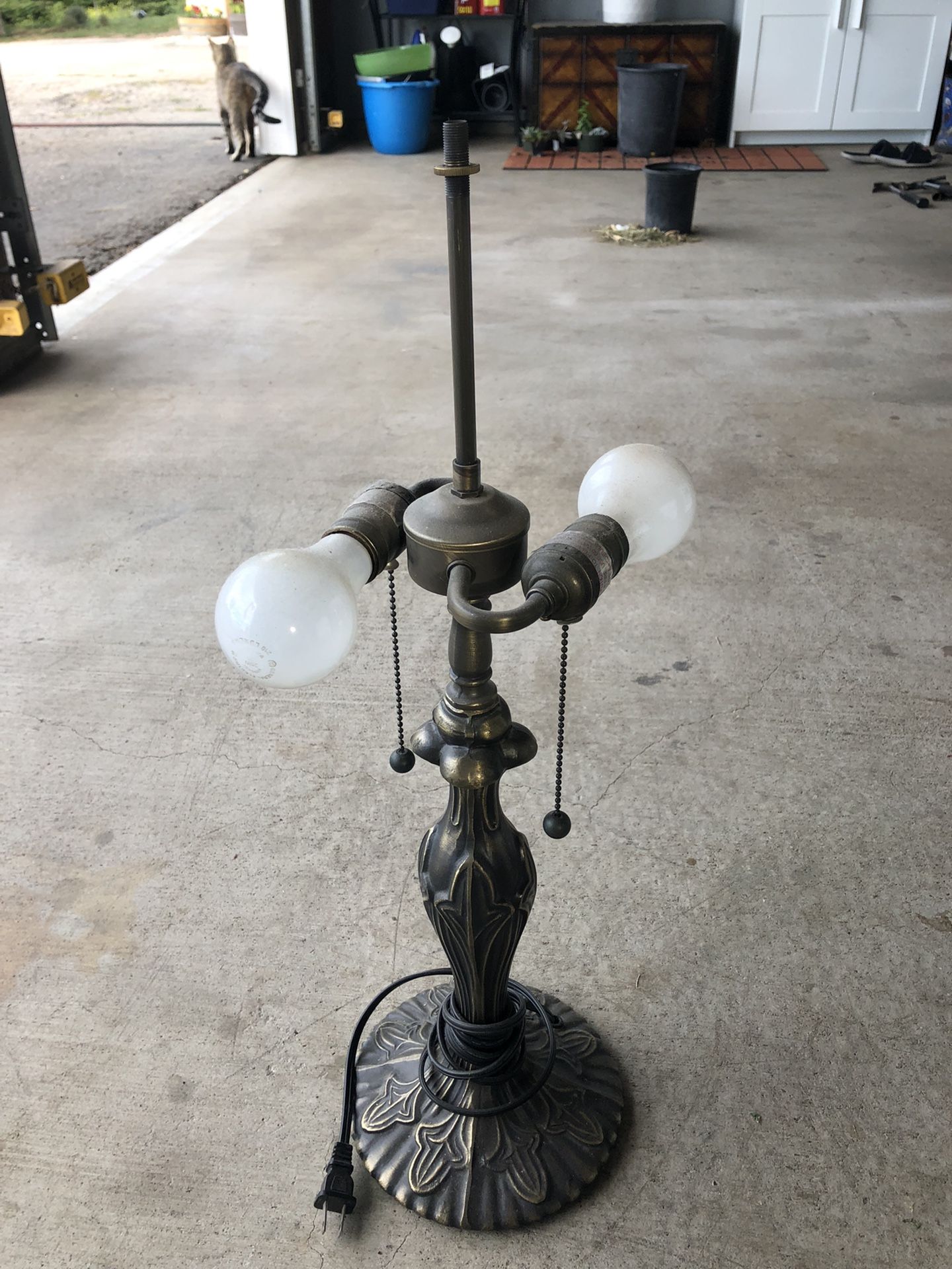 Sturdy solid lamp, metal, heavy. Lamp shade included free.