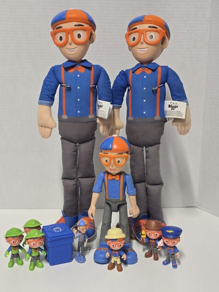 2020 Blippi Talking 18" Plush Doll- Moonbug $18 2020 Blippi Talking 8" Figure- Moonbug $12 2019 Blippi w/Recycling Bin 3" Figure- Jazwares $8 Recycling 3" Figure- Jazwares $5 Safari 3" Figure- Jazwares $5 "Sold" Airplane Pilot 3" Figure- Jazwares $5 Blippi Cake Topper $2 Cowboy 3" Figure- Jazwares $5