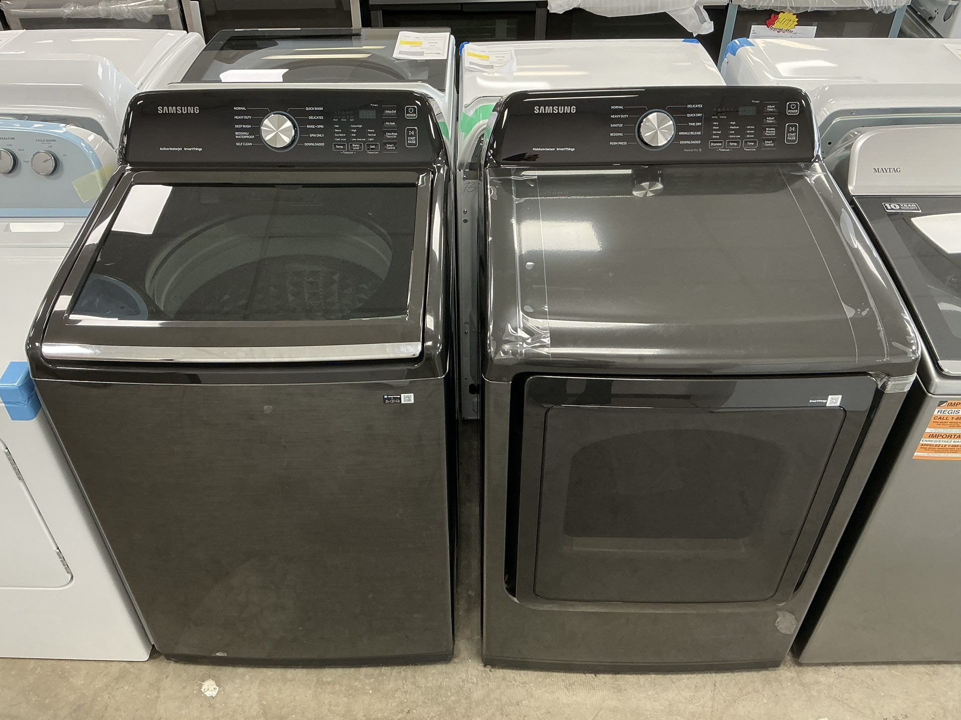 SAMSUNG SMART 4.7 cu. ft. Washer w/Impeller & Active Waterjet 7.4 cu. ft. Vented Electric Dyer w/Sen