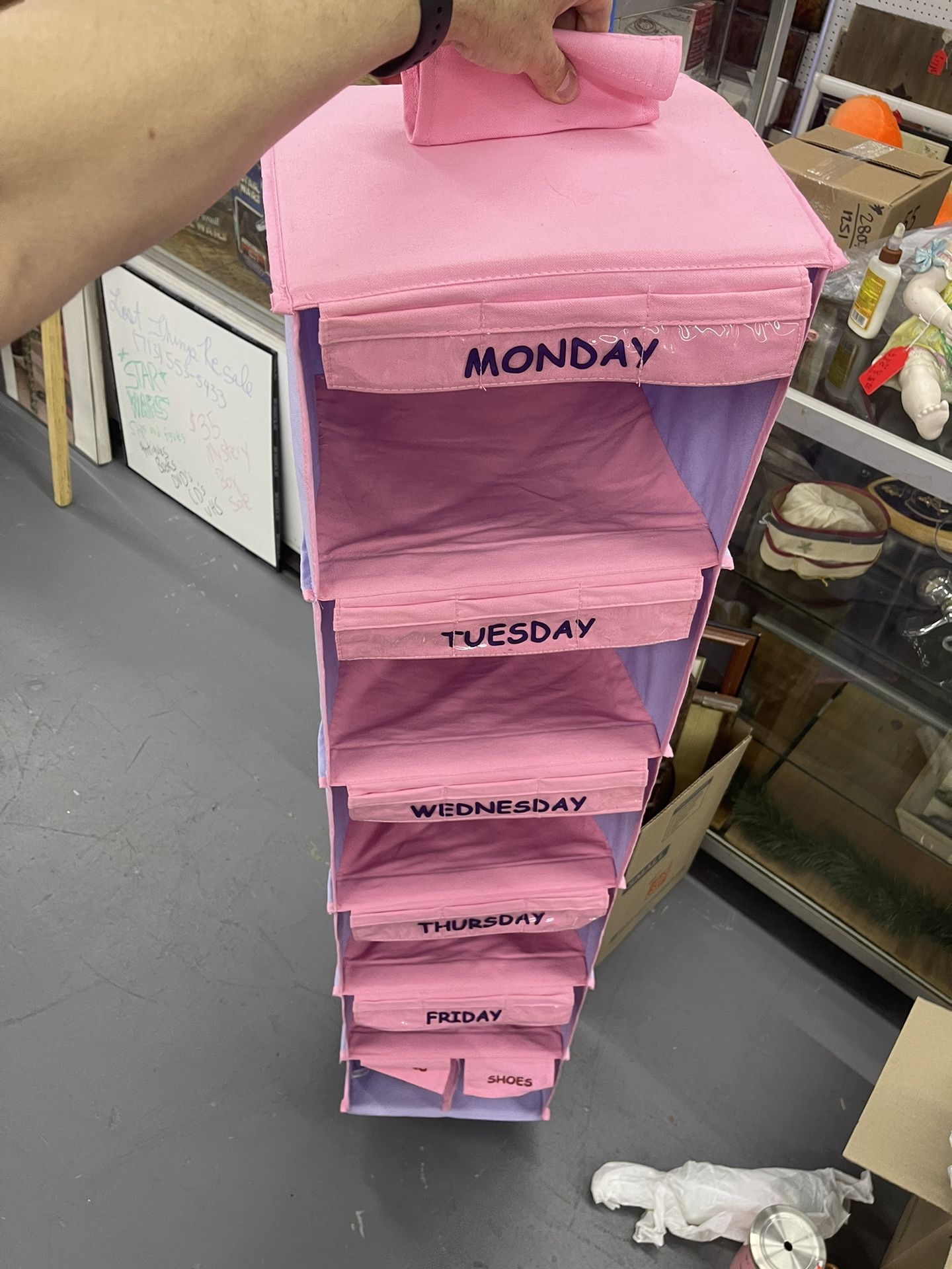 This is my super cool organizer. It hangs from your closet. You can put clothes or shoes or papers a lot of different things so you organize your life. Thomas (713)fivefivethree5433