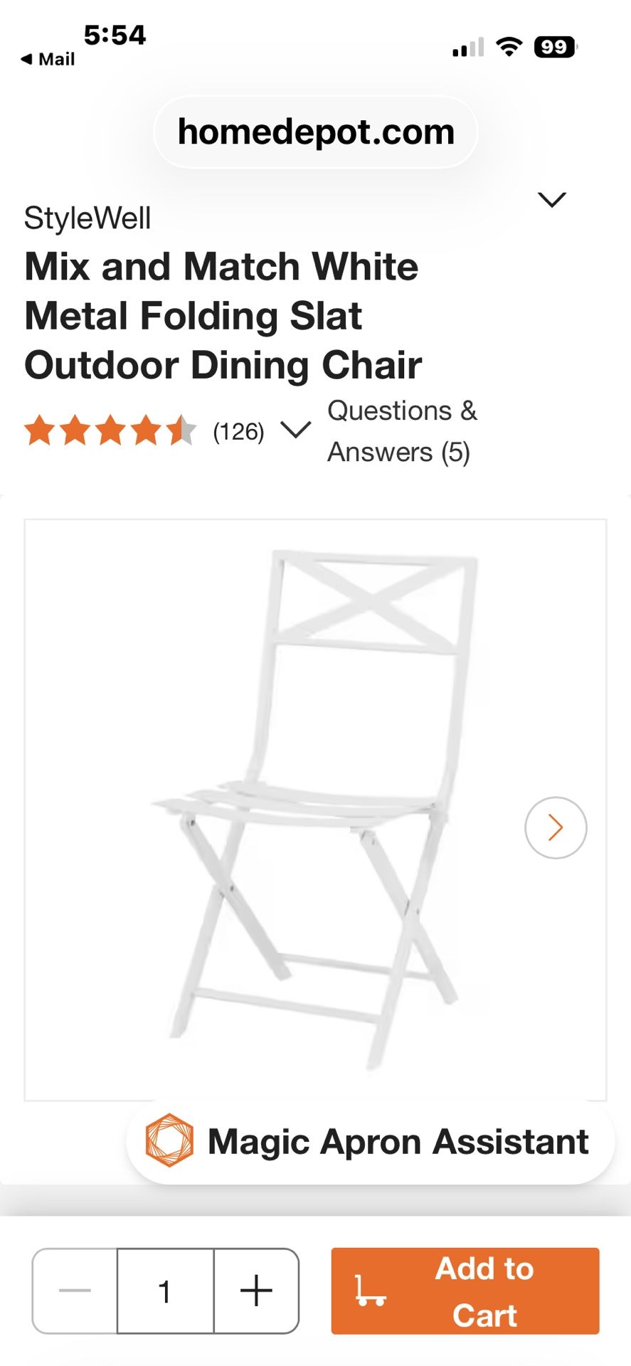 Four StyleWell Mix And Match White Metal Folding Slat Outdoor Dining Chairs