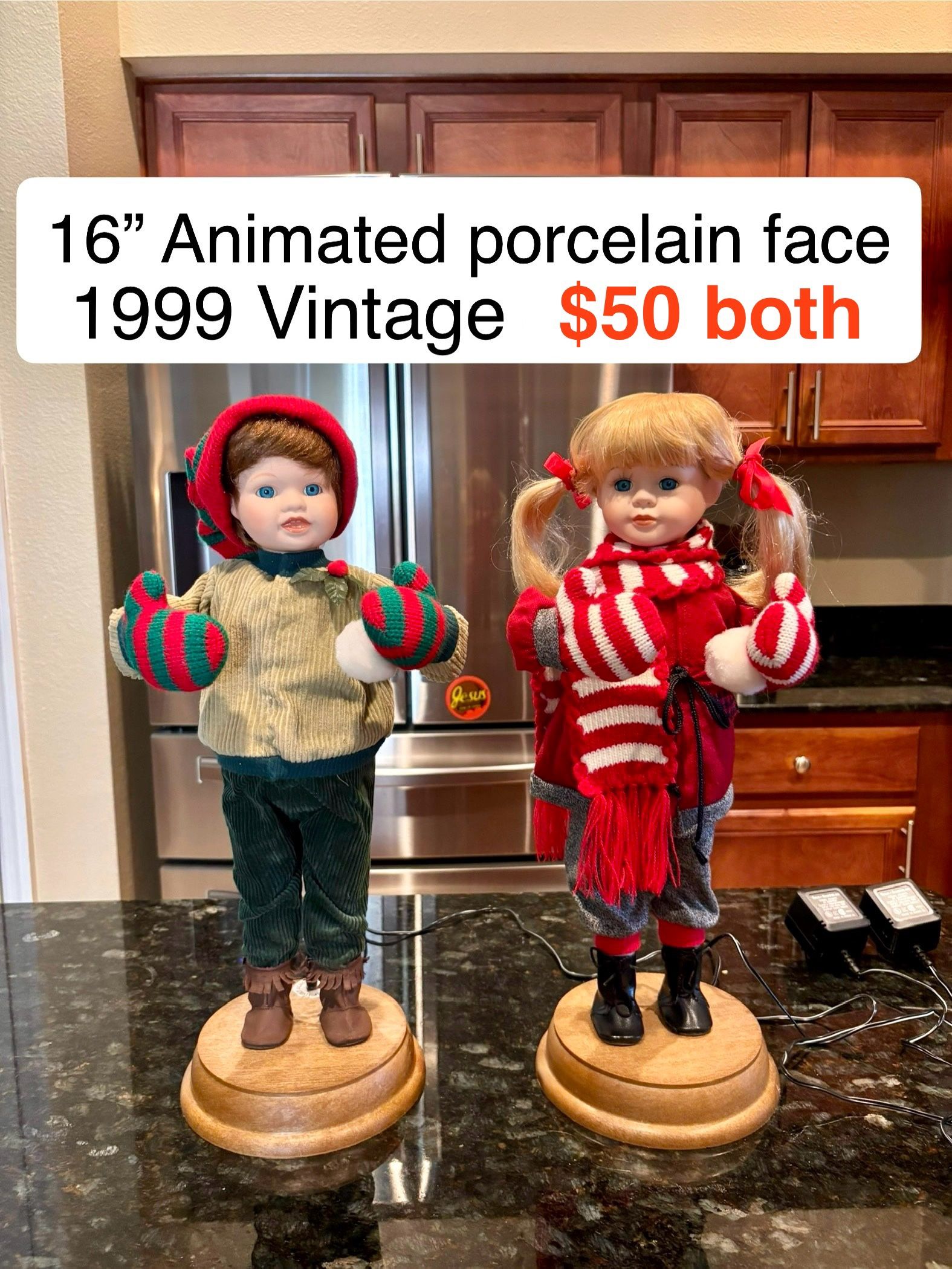 Excellent condition, non-smoking environment . 1999 Animated dolls with porcelain faces “throwing snowballs at each other” Original box for “Nicole” has some wear. “Josh” doesn’t have an original box (I store him in different box that will come with him). 16.5” tall, original adapter plugs are included. Cash only please. Local pick up in 33594