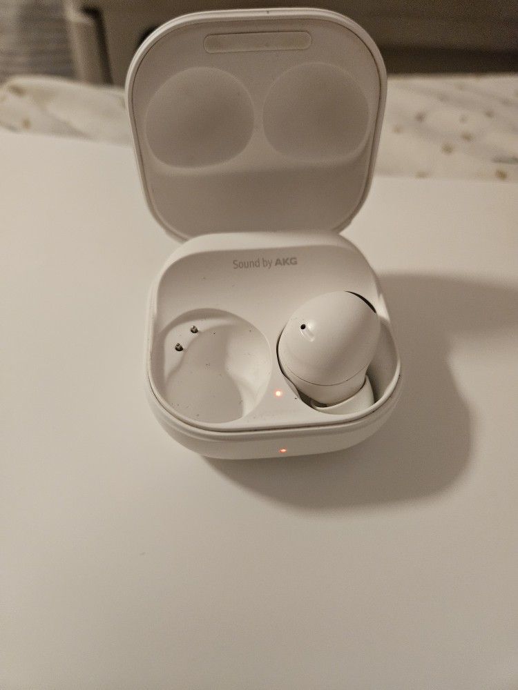 PLEASE READ: This listing is for the RIGHT earbud and the charging case only. The left earbud is missing. Perfect solution if you have lost your right earbud or need a replacement charging case. Includes: 1x Samsung Galaxy Buds2 (Right Side) - White 1x Charging Case (Sound by AKG) 1x USB Charging Cable Details: Model: Samsung Galaxy Buds2 Condition: Fully functional and holds a charge (see photos of indicator light). Cleanliness: Item has been sanitized and is ready for use. Compatibility: This will only pair with another Galaxy Buds2 left earbud; it will not pair with Buds Pro or Buds Live models.