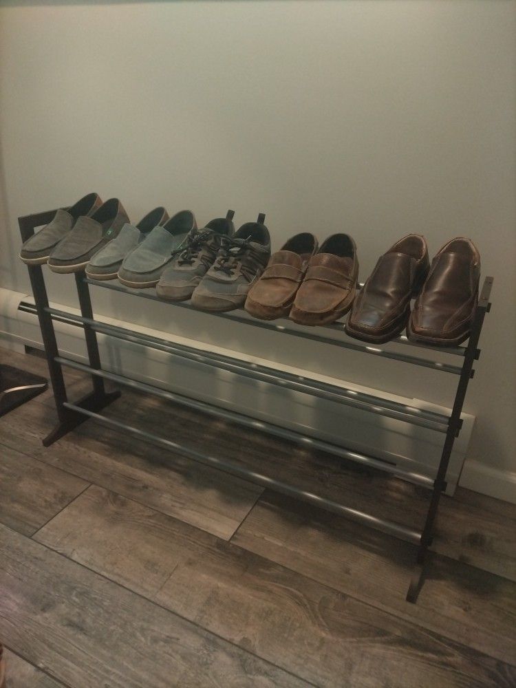 Color: brown with silver poles The four tier expandable shoe rack features a wood frame with metal rods, and an expandable width from 22.5" to 41.5" wide. Shortest length holds up to 12 pairs of shoes. Longest length holds up to 20 pairs of shoes, that's 40 shoes! Modify to fit your desired need or to accommodate any space. It's also stackable two high, with wide feet for stability. I will be posting a second one soon! No tools necessary for assembly.