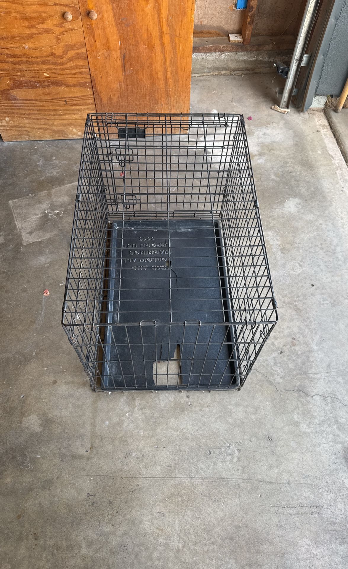 Used dog crate. The bottom portion has some damage you can re-buy it either online or at Walmart but that is the reason why I’m letting go for cheap. It is 30 inches long 20 inches wide for medium size dog or two small dogs.