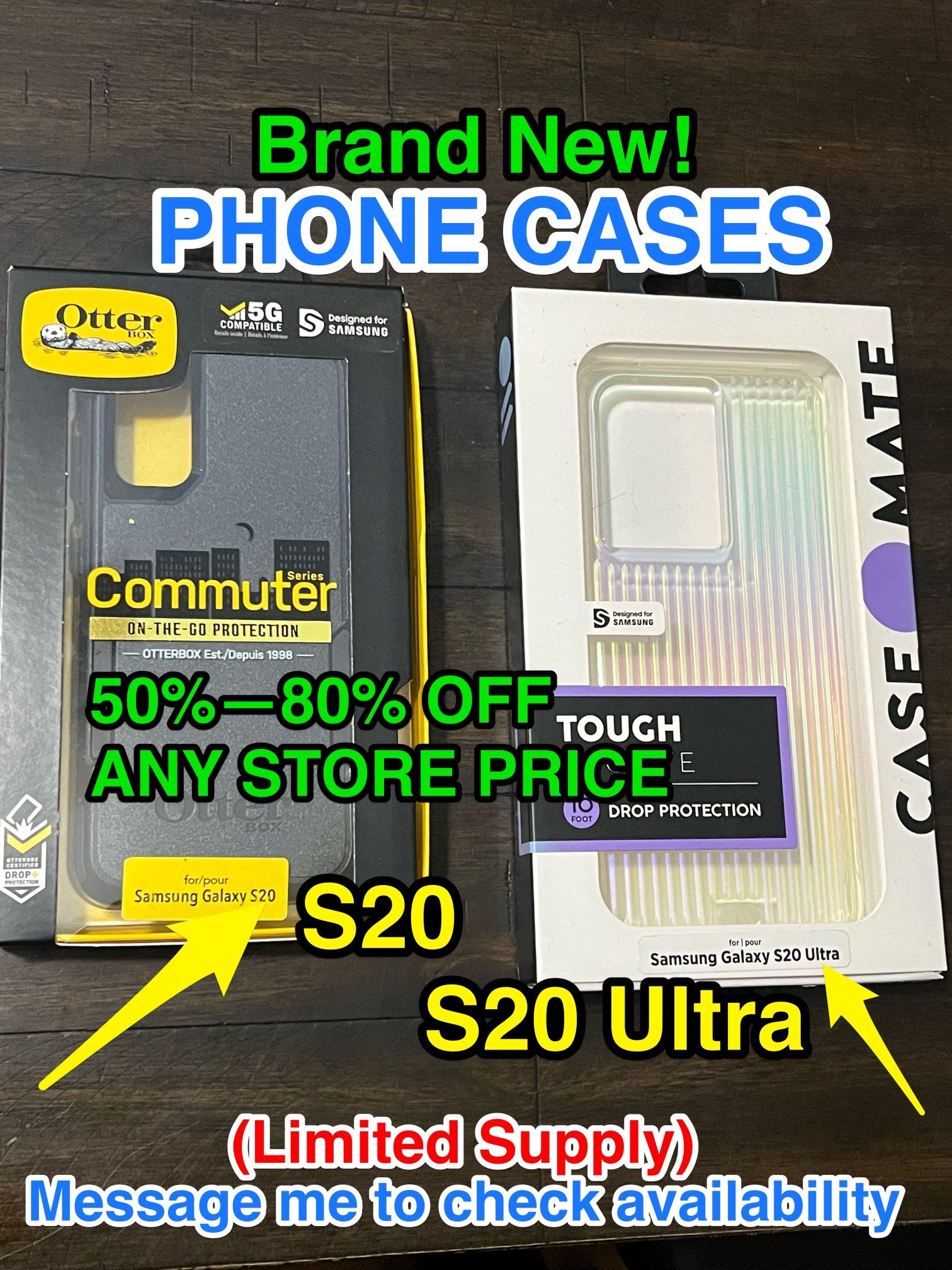 Hello everyone! This Listing is for: 👉 Brand New Phone Cases for Samsung Galaxy S20 / S20 Ultra Every case in stock is brand new or/brand new-open box. •Additional Pictures can be shared upon request for a specific case you are looking for 💵 I am confident this will be the best price locally and will beat any retail price to save some $$. (Listing Price is just a sample from the many variations that may not reflect local retail pricing). 💵 Asking Price is flexible for these according to local retail pricing. I am offering 50% or more off any price. Message me and I will be happy to work out a deal with you! ⭐ Satisfaction guaranteed — or I am willing to compensate if necessary. ✅Special Notes: Discounts are offered for bundle purchases or for combining with other items on my page. (Please view/search my page for the listings that meet your current need and we can work out a deal.) 📦 Buyer Notice: Boxes, packaging, or protective coverings (if any) sometimes may show signs of storage wear including but not limited to scuffs, tears, dents, etc. 📩 Message me with any questions or to check availability. If this listing is available, then there will be more for sale. 📍 Pickups are in Paramount, CA 90723