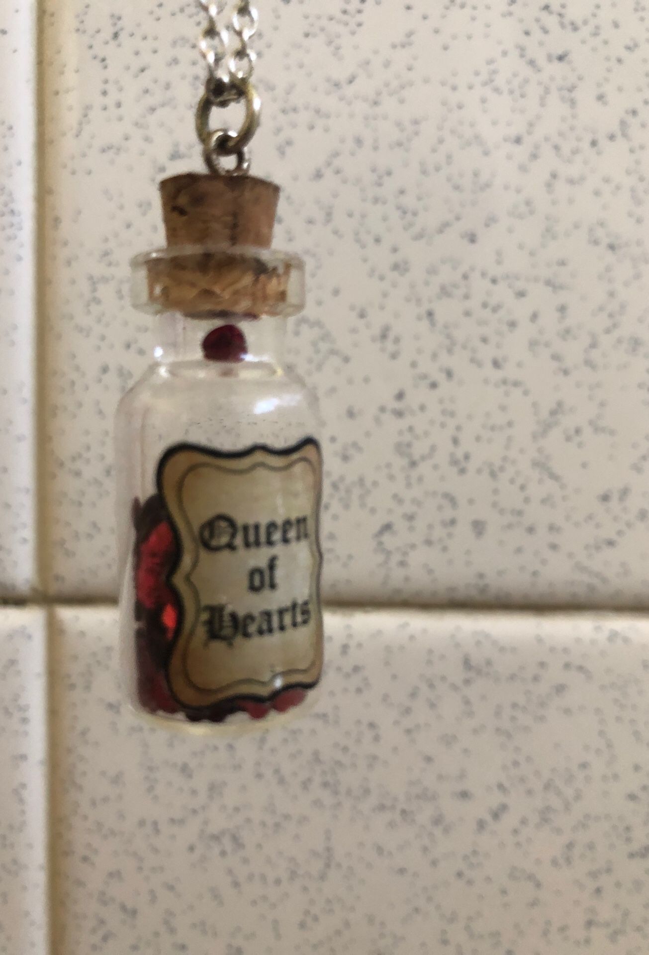 Disney Queen of Hearts. Has little hearts confetti inside the bottle. Rare. Adjustable chain.