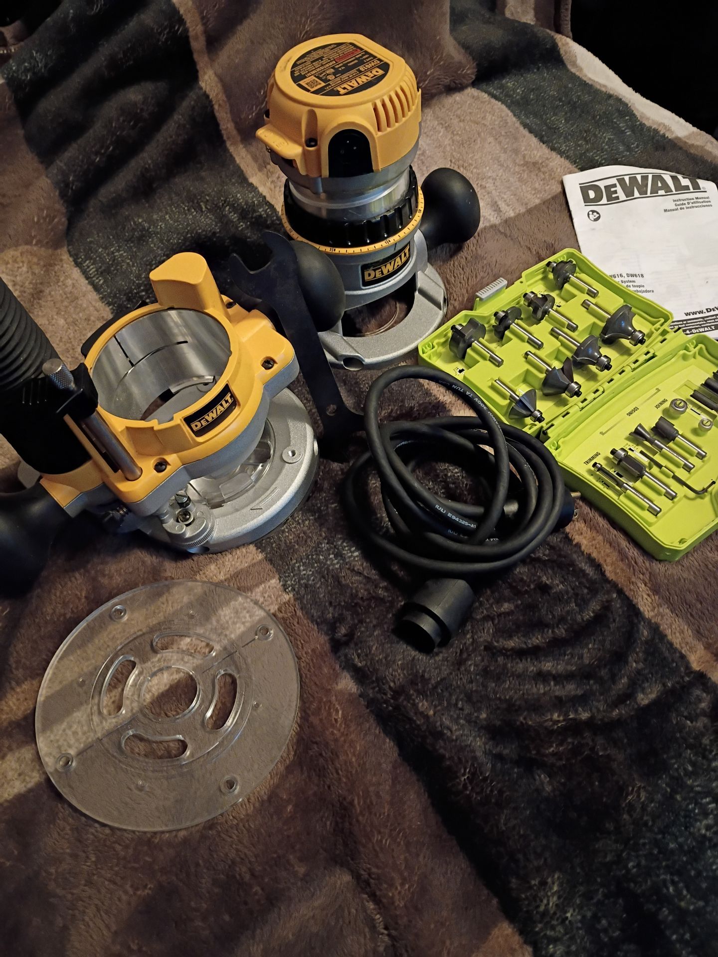 DeWalt Router, only used once for a car speaker box project. Comes with a base, electric plug, tool for removing router bits and router bits included. Asking $180.00