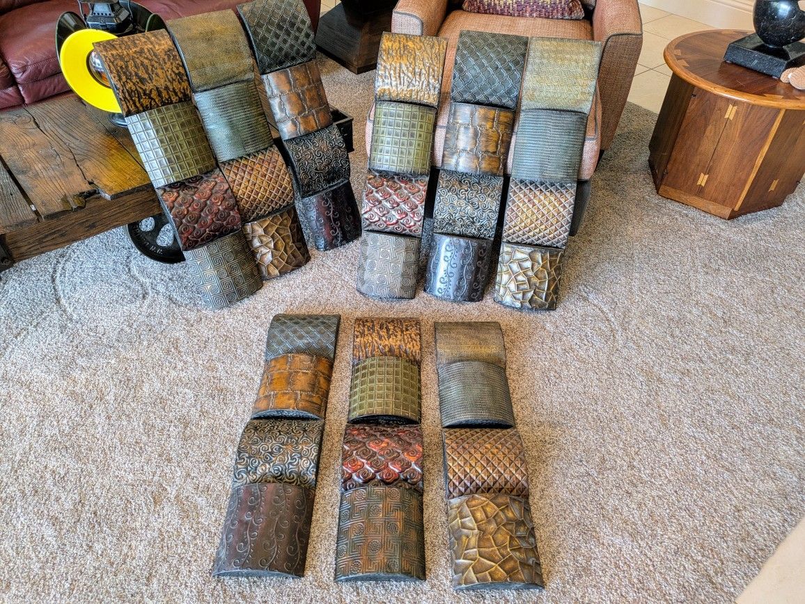 Hello and thanks for looking. I'm redecorating and these 9 pieces are no longer needed. They are designed in sets of three, so you are getting three sets. They are sturdy and have multiple hanging options on the back. You can hang them either horizontally or vertically. Each piece measures 32" x 8" x 1.75". They are in excellent condition and come from a smoke-free home. $90 for the nine-piece collection. I'm located just east of the Orlando International Airport. Thanks! Pete