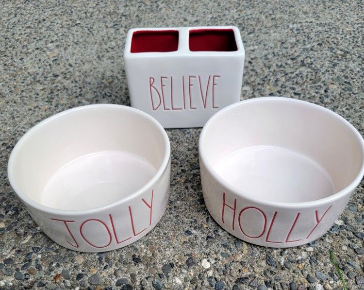 New Christmas theme Rae Dunn bowls and vanity toothbrush/miscellaneous holder. Perfect for the upcoming holidays. Thanks for looking. $10 ea or $25 for the set.