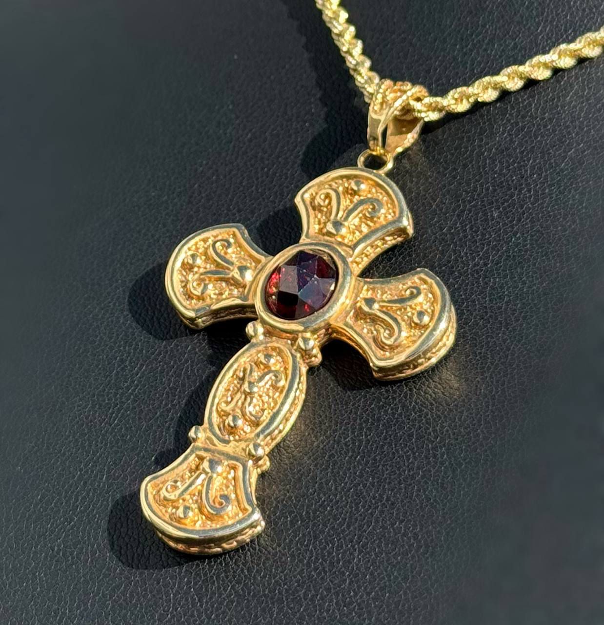 This gorgeous Religious Cross pendant is made of 14k hollow yellow gold with colored ruby stone. Total weight: 4.70grams. It is very beautiful piece. 💠😘💠 You can wear with chain, looks very gorgeous🤩🤩🤩 Perfect gift! ❤️💍🎁 Approximately the total carat weight of the ruby stone is approximately 2.00CT. Length - 60mm, width - 35mm Chain sells separately‼️‼️‼️ We buy Rolex and Audemars, patek . Do layaway in VIP SHOP Coral Springs 🔥💎💸 We buy gold, diamonds, silver, coins 🥳🔥