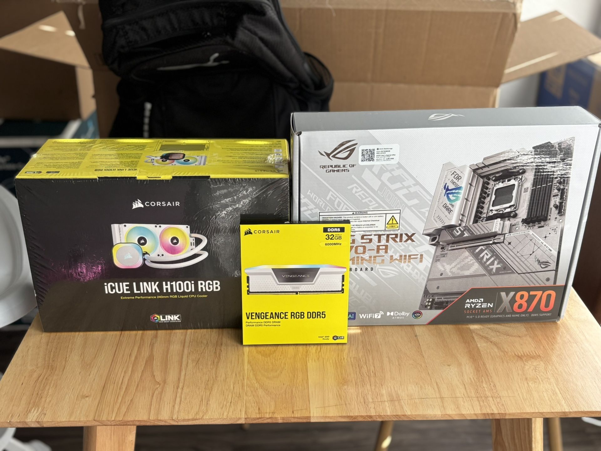 Selling three different items, pieces for gaming pc. Will sell in a package for $680 or will sell items individually. Brand new unopened boxes. Open to offers Individual Pricing: CORSAIR Vengeance RGB 32GB (2 x 16GB) 288-Pin PC RAM DDR5 6000 Desktop Memory [$400] Corsair iCUE H100i RGB Liquid CPU Cooler - QX120 RGB Fans - White - 240mm [$100] ASUS ROG STRIX X870-A GAMING WIFI AMD AM5 X870 ATX motherboard 16+2+2 power [$250]