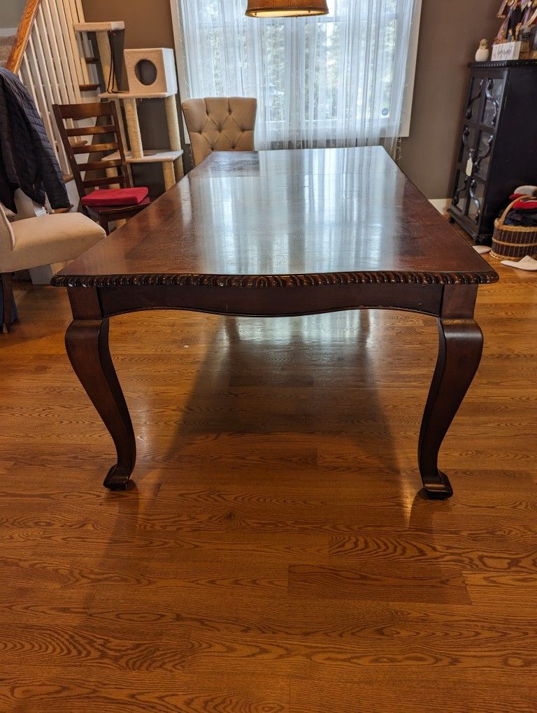 94x46 with the leaf in. Leaf is 24 inches. Without leaf, it is 70x46. Well loved dining room table seeking new family to love! This table has been amazing for our family! Regularly seating between 8-12 people at it!! It has some marks/imperfections on it, but it is well made and very solid still!