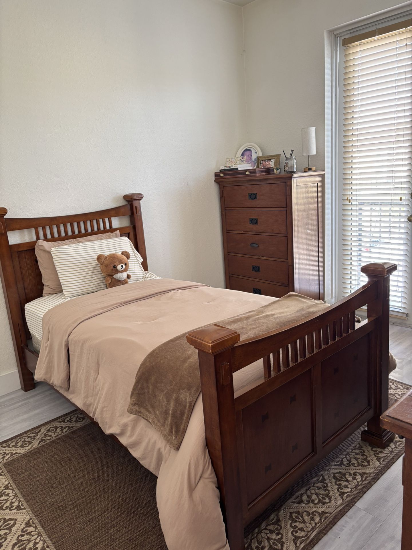 This twin bed is made of solid real wood. Normal wear in very good condition. Mattress, comforter, and sheet sets available if wanted.