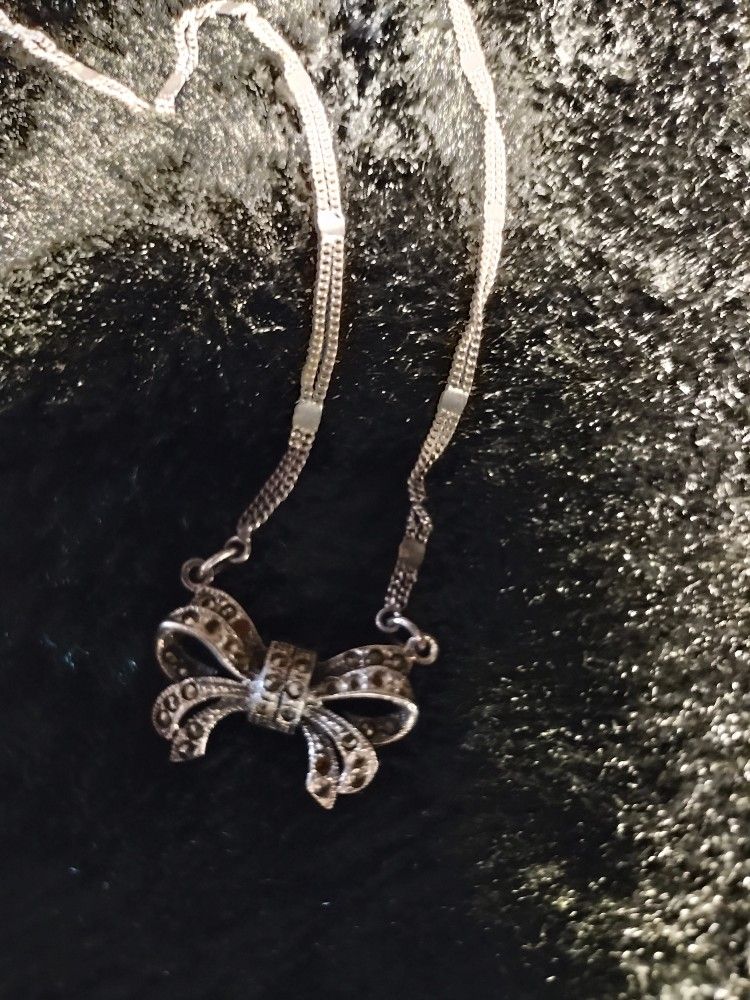 Sterling Silver Marcusite Bow Pendant Necklace Vintage