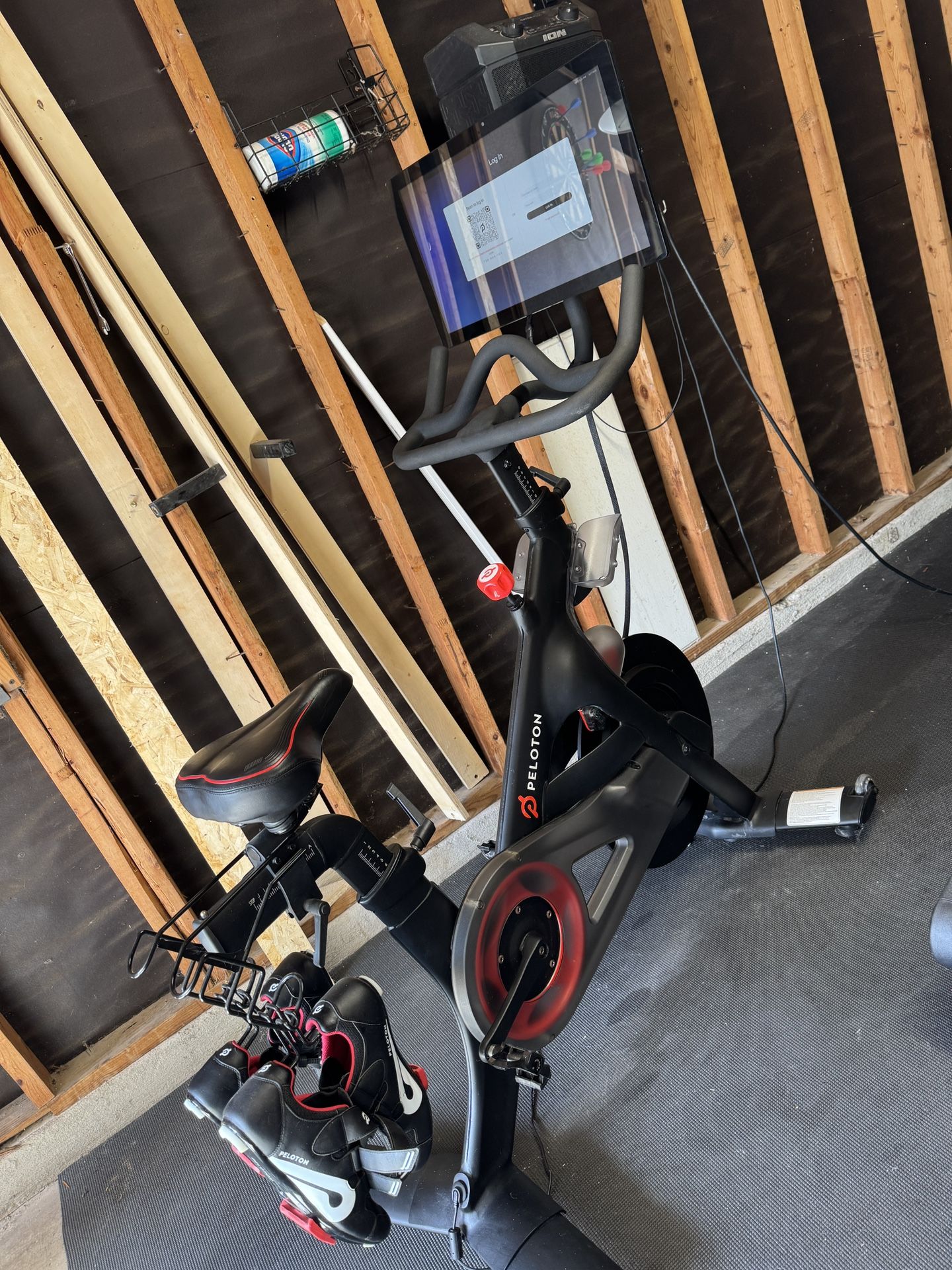 Peloton Bike with Swivel Screen Attachment, upgraded padded seat, 3lb weight set, (2) sets of Peloton headphones. Shoes optional.
