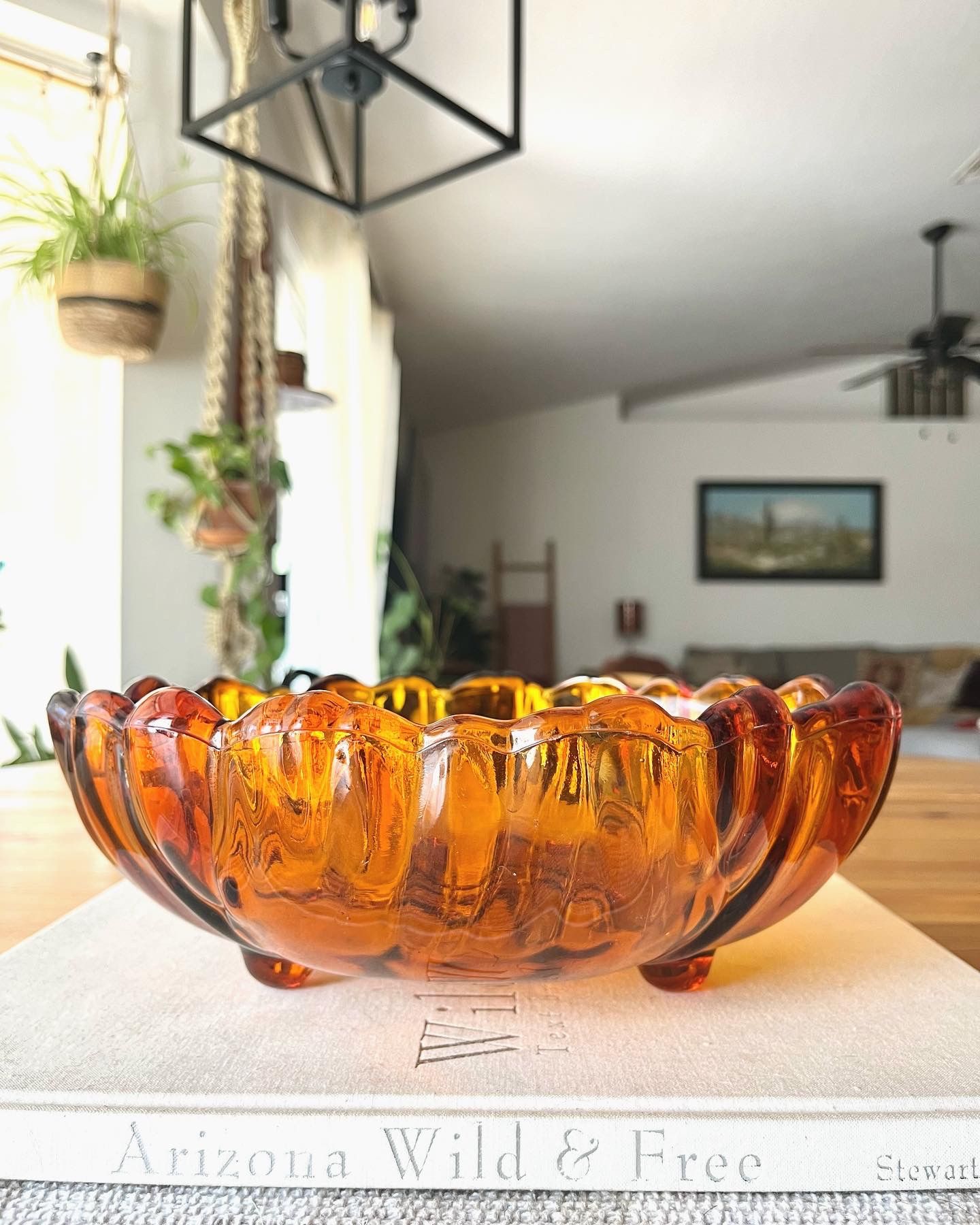 Vintage Large Amber Thick Glass Footed Bowl. Beautiful orange amber color perfect for fall decor. Very thick heavy glass. Measurements in photos. Please check out my other listings :)