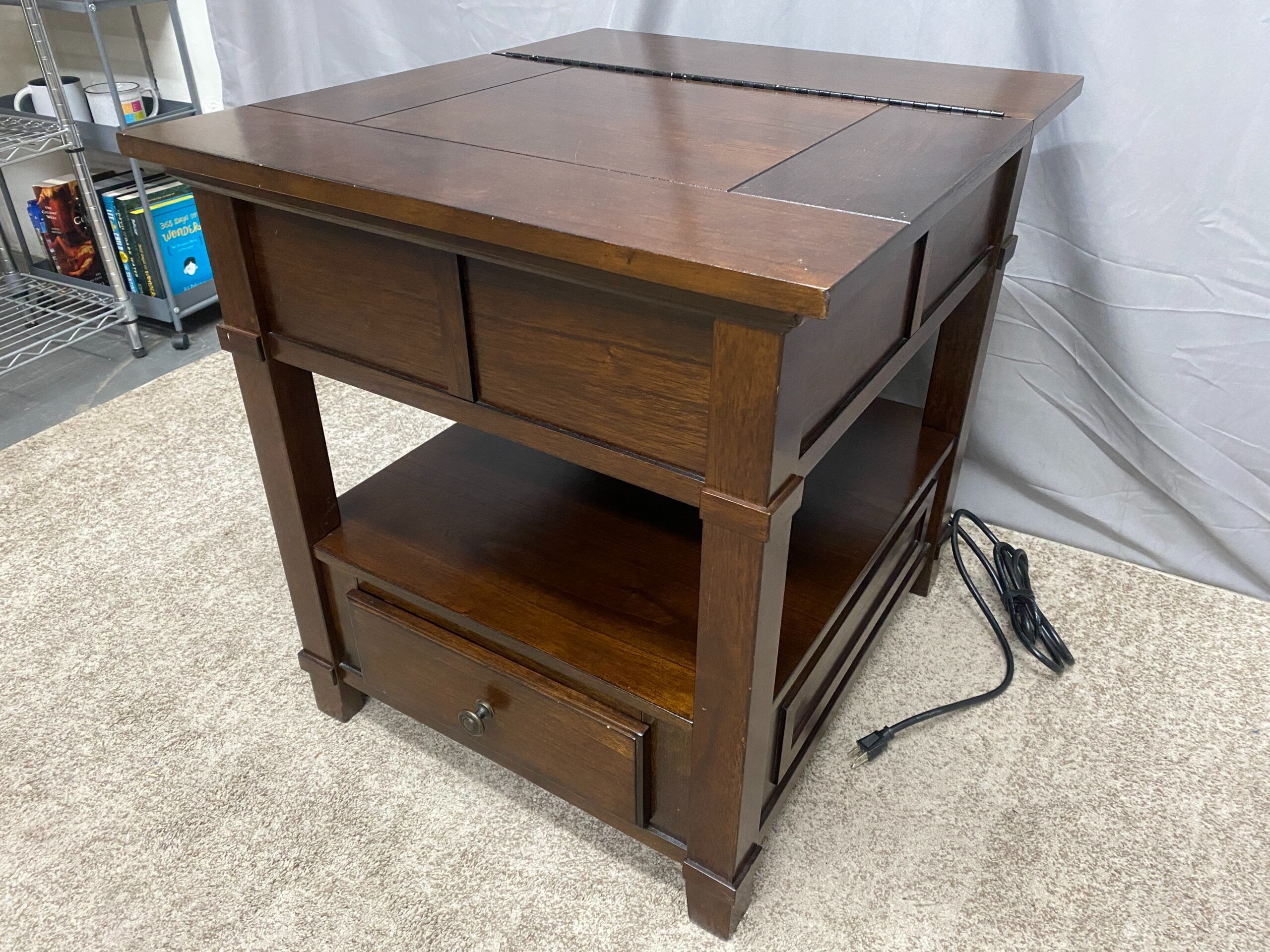 Dark Wooden Lift-Top Side Table w Built in Extension Cord