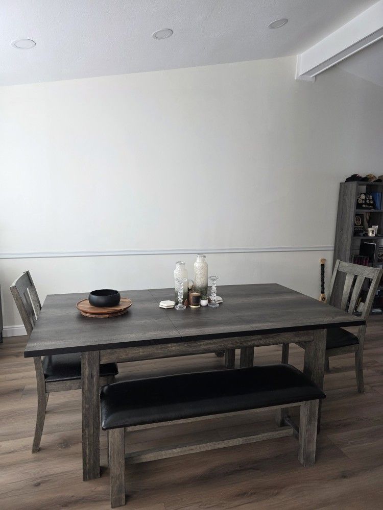 Gray-Brown Dining table Set with leaf extension, 2 benches seating 2-3 each and end chairs. Sturdy and well built!