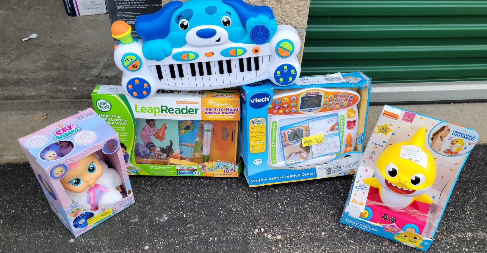 Mini Toy Piano 1× Cry Babies Doll 1× Baby Shark Dancing DJ 1× Vtech Write and Learn Creative Center 1× Leap Frog Leap Reader This lot contains a mixture of new and used items. SOLD AS IS.