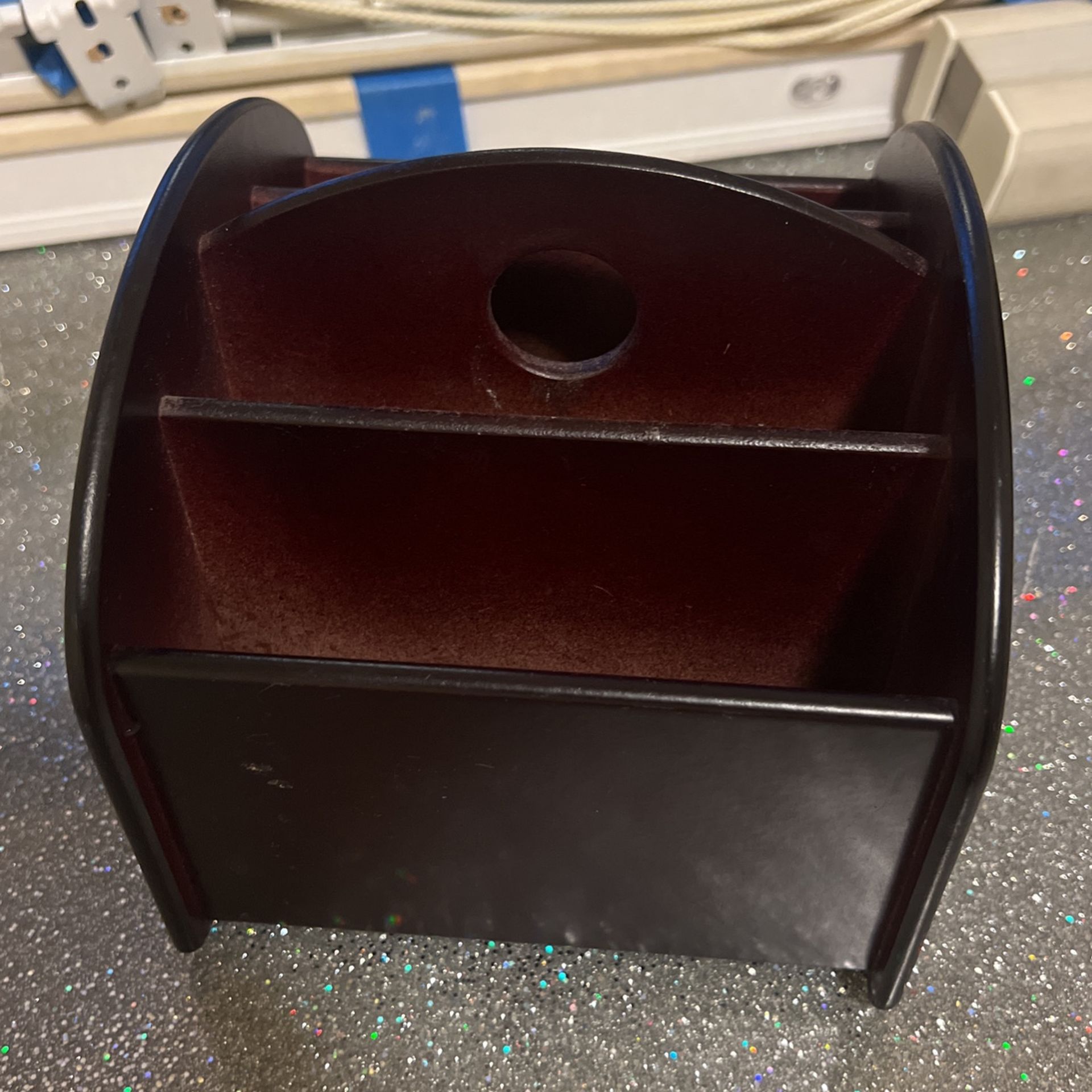 Swivels from front to back Holds cellphones and chargers and whatever else.