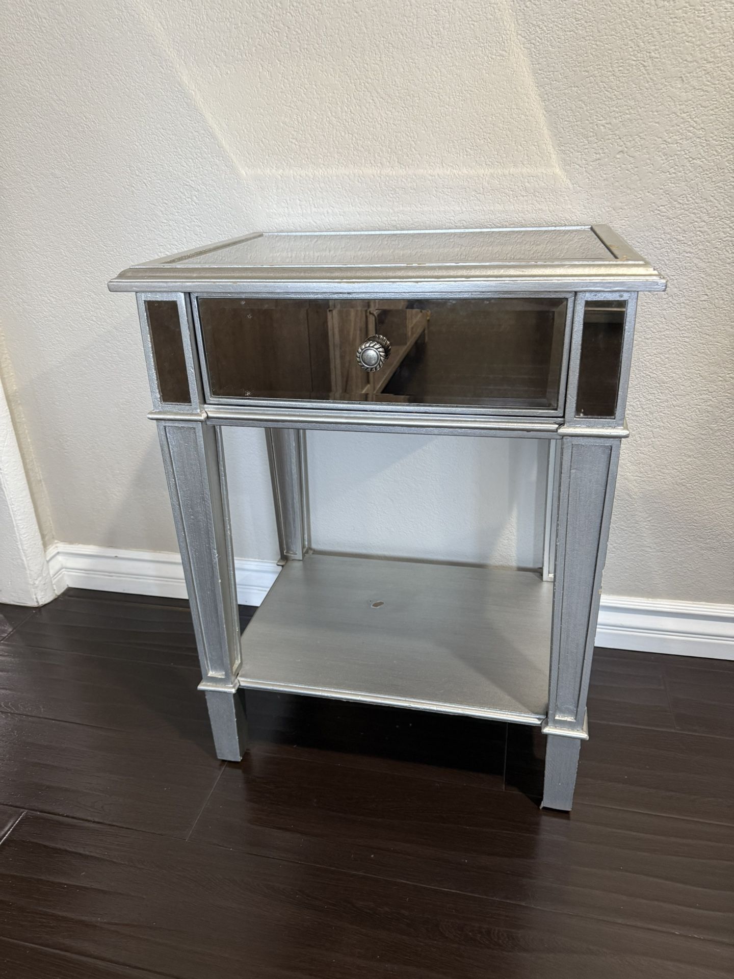 Set of 2 beautiful nightstands Color is silver with a mirrored style 1 drawer on each nightstand With bottom shelf Used but in good condition These were Pier 1 import exclusives Nothing is broken Few chips of paint as show in the pictures but can be touched up. Redecorating our room and have no more use for these. Originally purchased for $299 each. PICK UP ONLY Check out my other listings of items that go perfect with this color combo. Lamps Dresser Photo frames