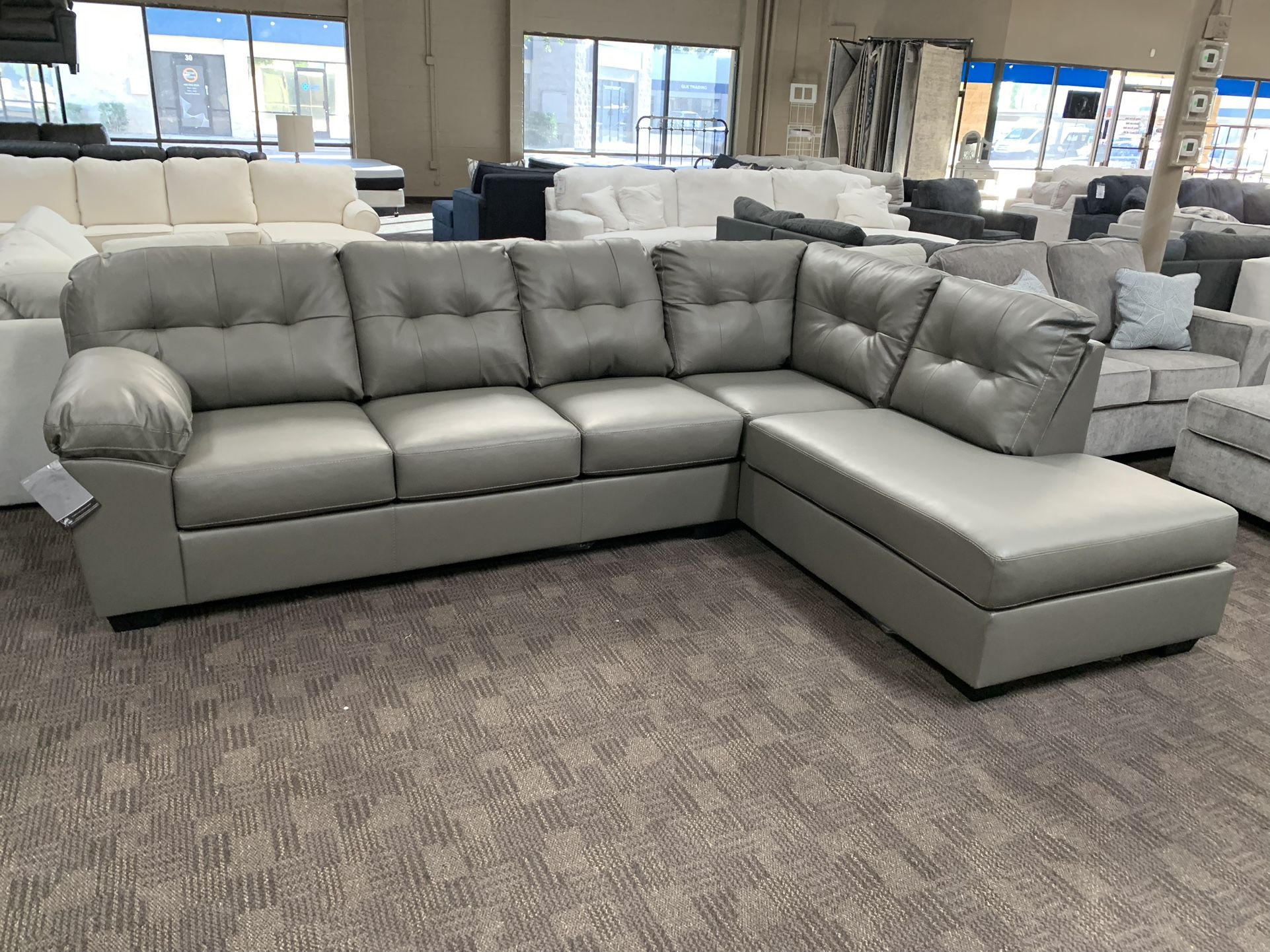 Brand new Grey leather sectional. Plush cushions, very comfortable! Left or right chaise side available. Matching recliner $450