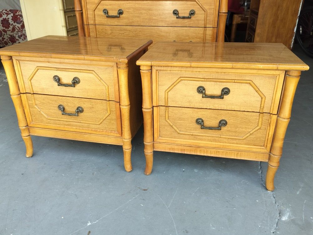 Vintage Pair of Faux Bamboo Nightstands by Broyhill. Excellent vintage condition. I have the matching 5 drawer Tall Boy Dresser that I will be listing separately. 22H x 24W x 16D