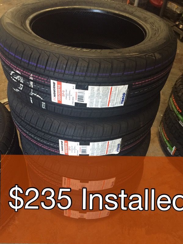 Set of 4 205/55/16 Tires with a warranty!!!! Mounted and Balanced at TWO GRINGOS TIRES for only $235.00. If this isn't your size just let me know what size you need! Check out our reviews, then let us become your favorite tire shop!!!! We also carry used tire that all come with a 30 day warranty. Thank you! We look forward to getting your tire needs met.
