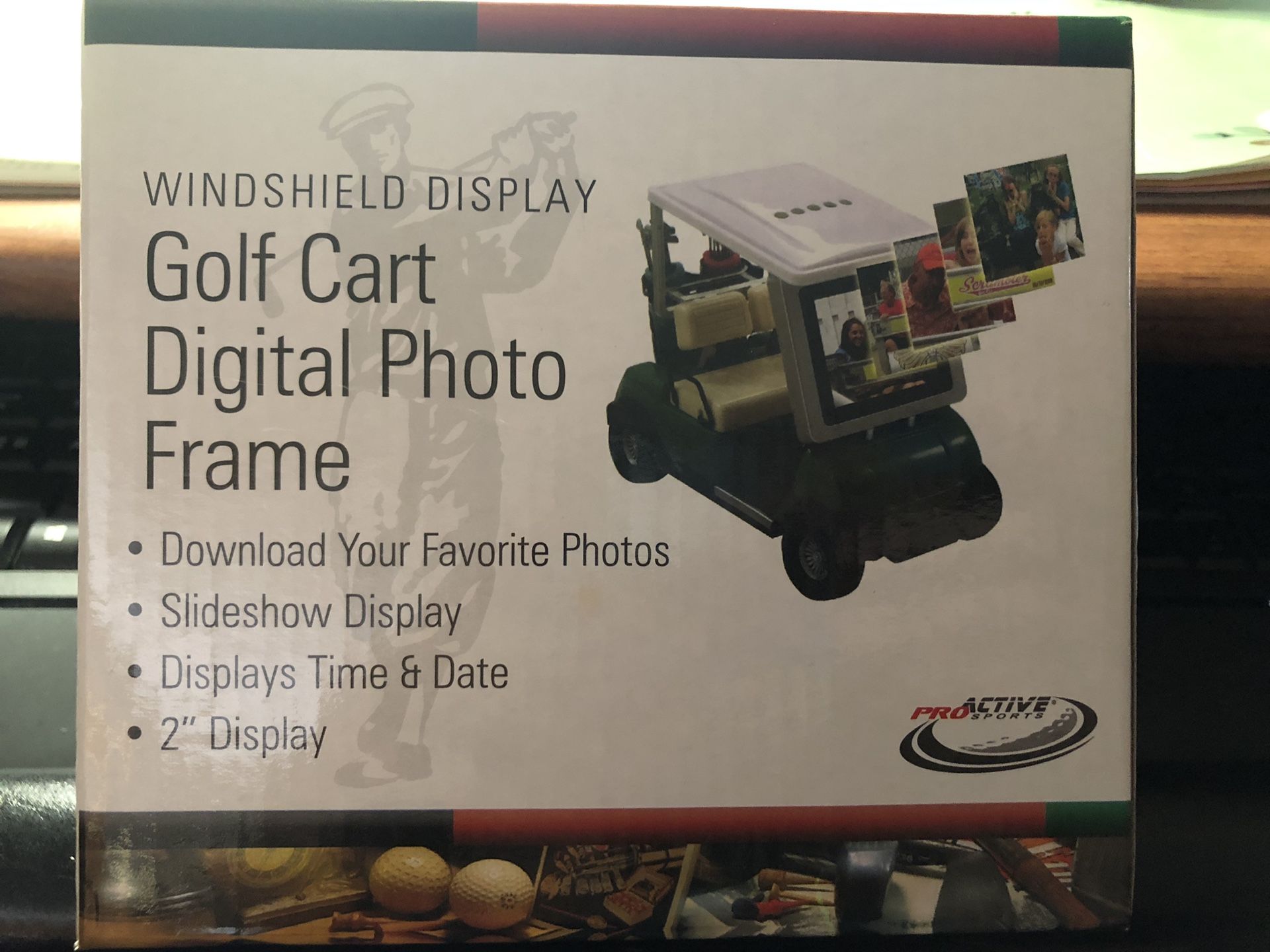 Golf cart digital photo frame. Not available anywhere any more. Great gift for the golfer to show off his great shots and family. Brand new in box. Never used.