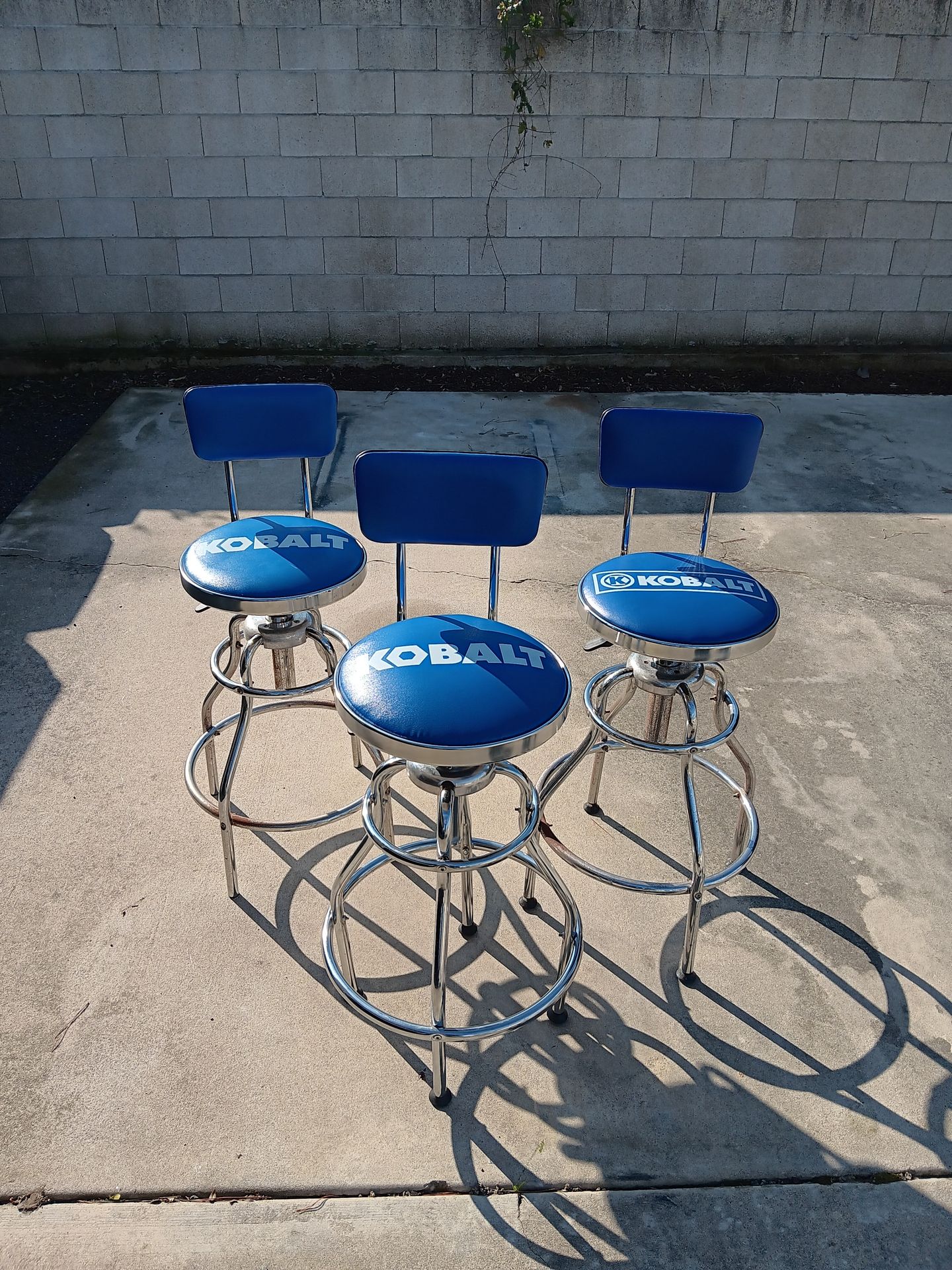 2 kobalt bar stools. Adjustable back rest, raises and lowers and 360° swivel. A little bit of rust on the metal but appolstry is in good condition. Used bar stools and works great for work bench or in a shop or garage.